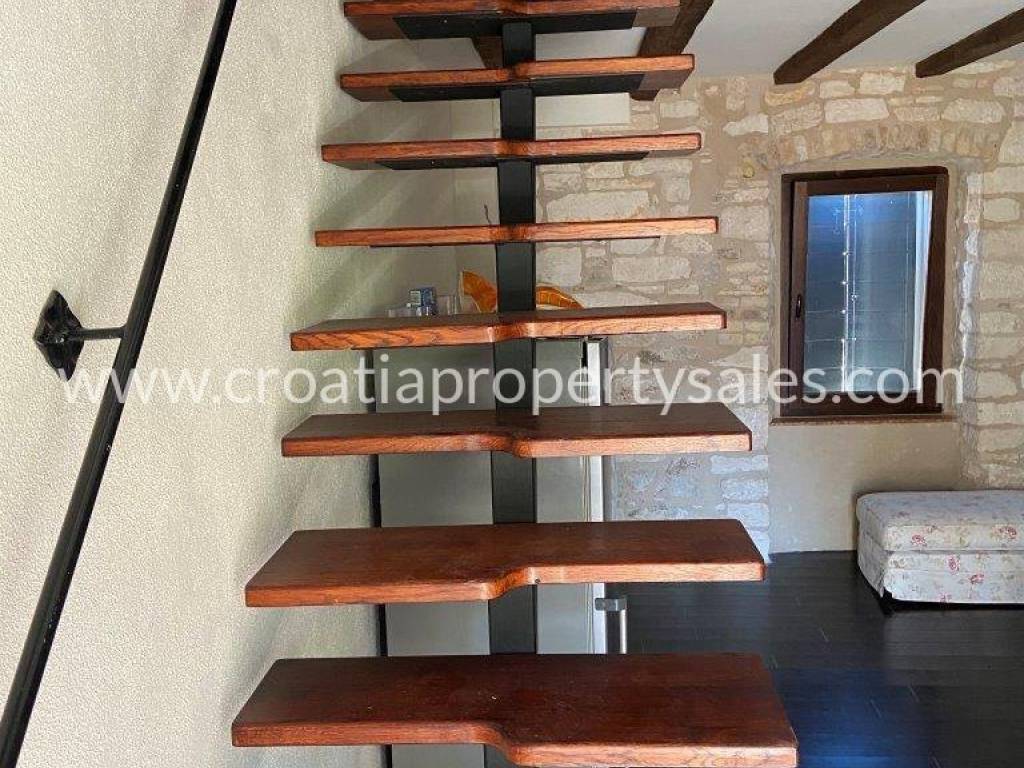 Internal wooden stairs lead to the second floor, where two bedrooms and a bathroom are located.