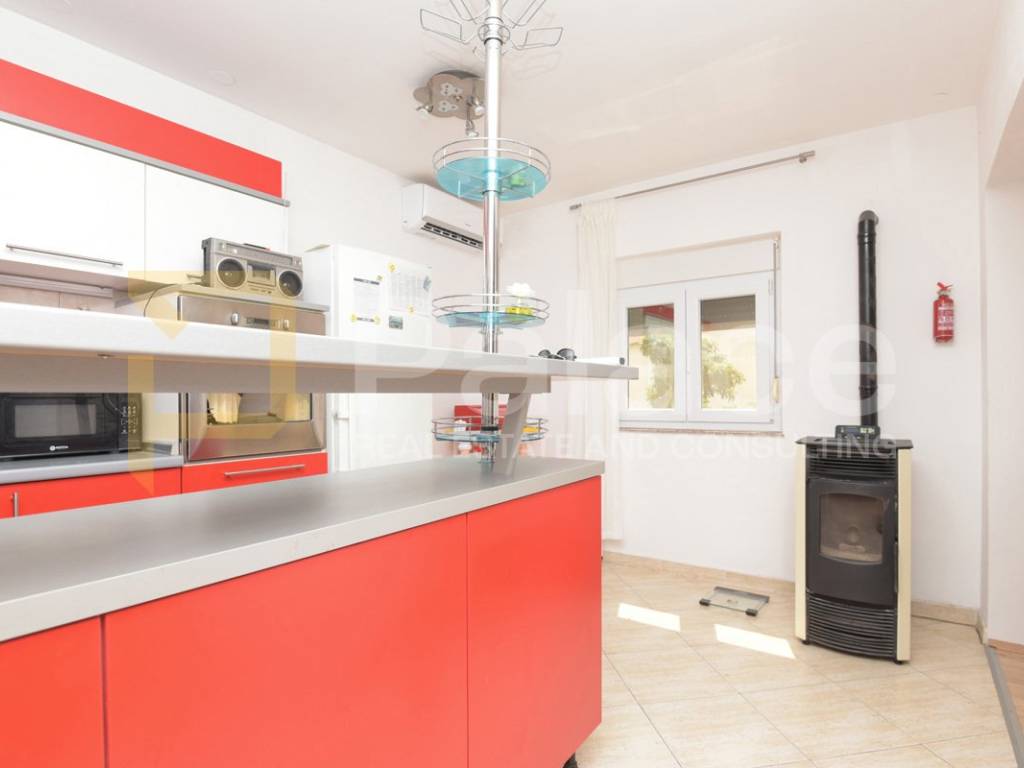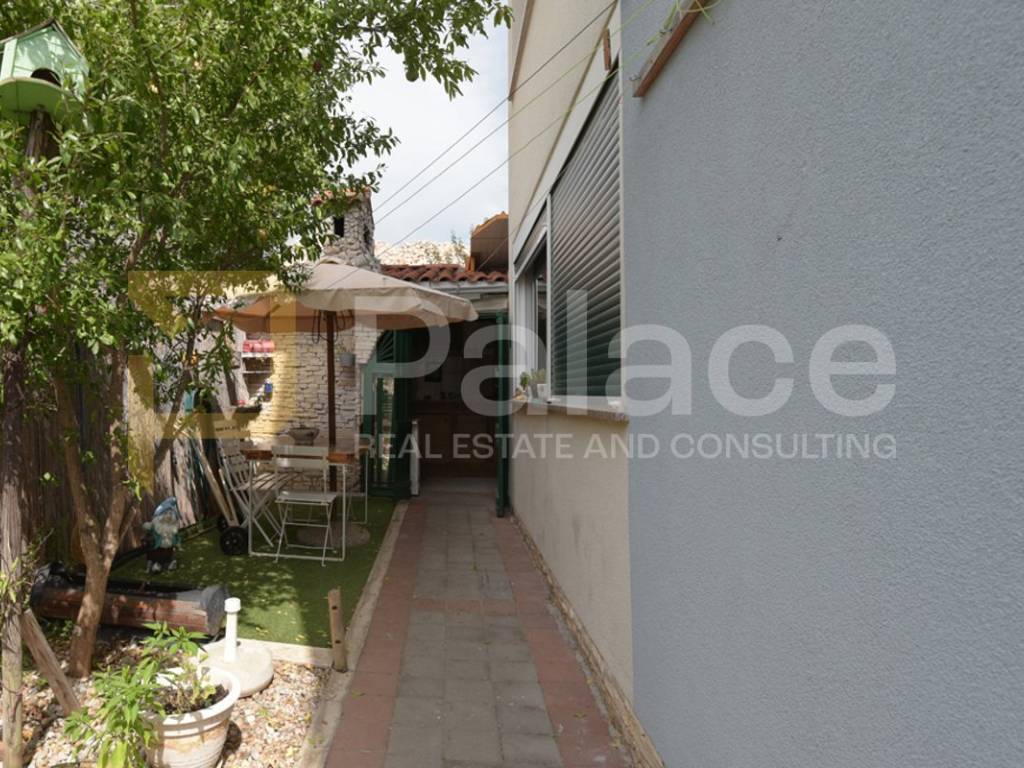 The 84 m2 apartment consists of a spacious living room, kitchen, dining room, hallway, bathroom, toilet, and two bedrooms, one of which has access to a balcony leading to the outdoor area. In that part, there is a covered space for socializing, an outdoor table, a small kitchen, and a barbecue. The layout of the apartment is excellent, with the hallway separating the living area from the sleeping area. The windows are PVC with built-in mosquito nets. It has an air conditioner as well as a wood-burning fireplace.