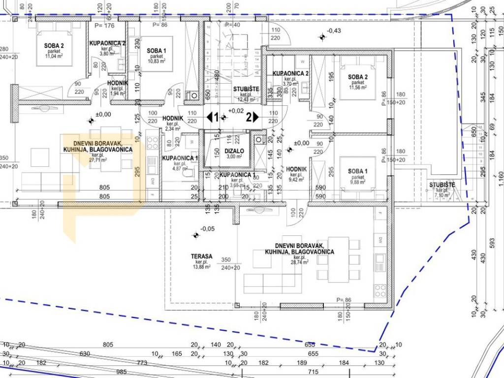 The apartment consists of two bedrooms, two bathrooms, a living room with access to its own garden, and a kitchen with a dining area. A parking space is provided in the garage, as well as a corresponding storage room in the basement. The storage area is 4.07 m2 and the garage space is 6.72 m2, giving a total area of 81.21 m2.