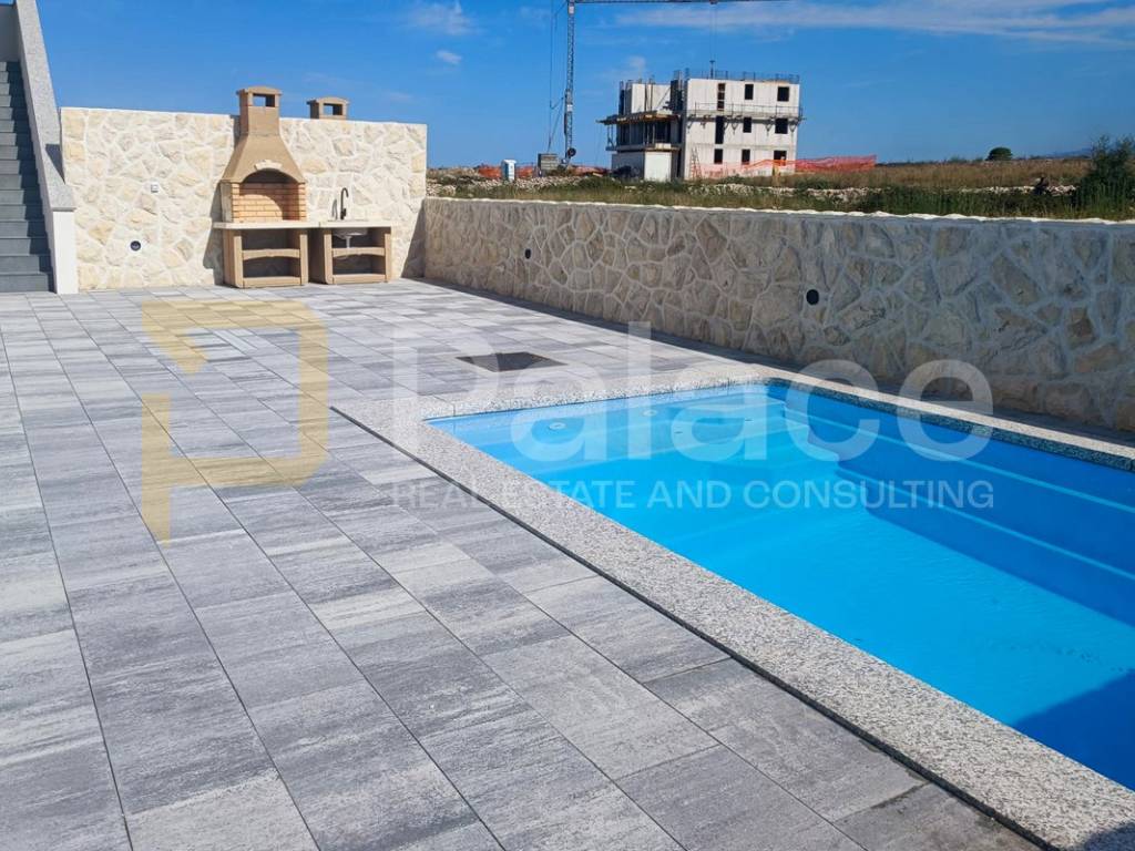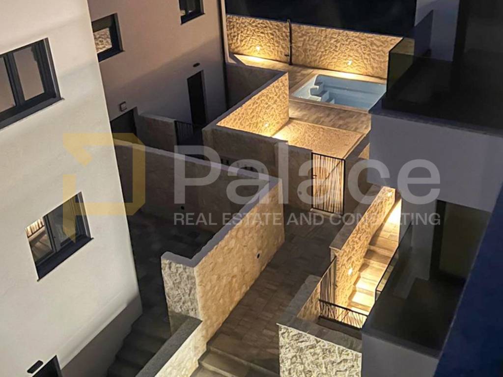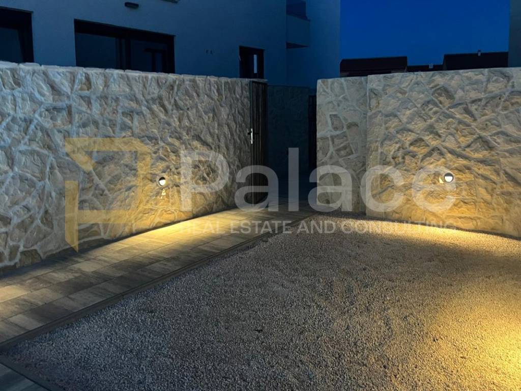 A modern two-bedroom apartment (S5) on the 1st floor of a new building is for sale, situated approximately 350m from the beach Mali Dubrovnik. It consists of a living room, two bedrooms, a bathroom, a loggia, and a 44m courtyard with a 7x3m pool. The apartment is equipped with Bosch air conditioning units in all rooms, burglar and fireproof doors, first-class ceramic floors, luxurious sanitary ware, aluminum-wood windows with triple glazing filled with argon, insect screens.