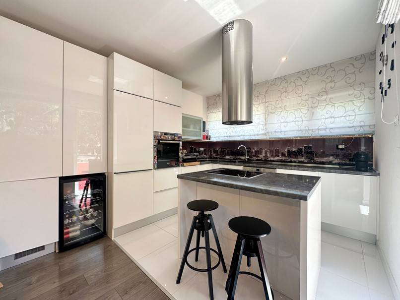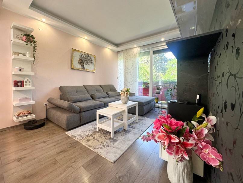 The apartment is located on the first floor of the building and covers an area of 83 m2, and consists of two large bedrooms, one of which has access to its own balcony, bathroom, hallway, open space kitchen with dining room and living room, and even three balconies. Equipped with custom-made furniture for maximum use of space, in this apartment, as much attention was paid to the arrangement and functionality as to the aesthetics of the apartment. The apartment is sold fully furnished and does not require any additional investments.
