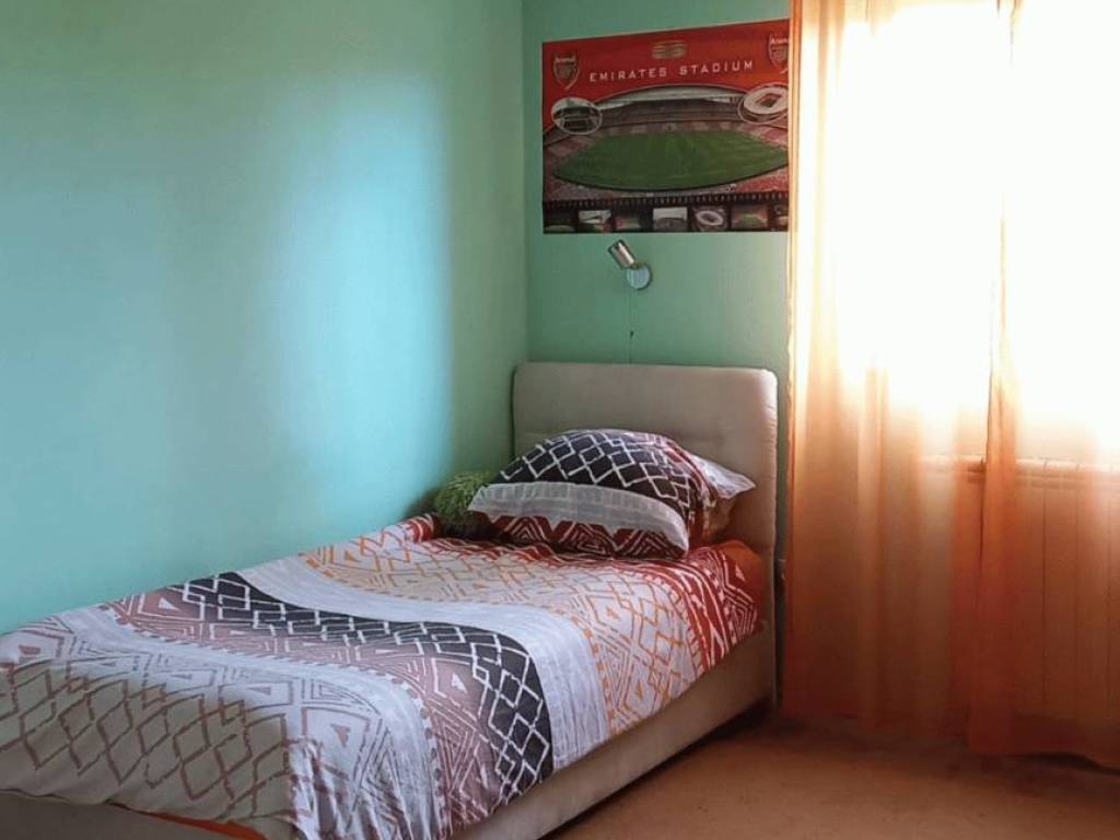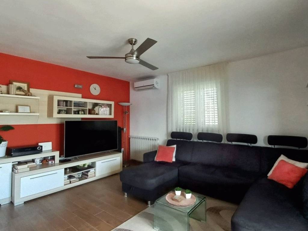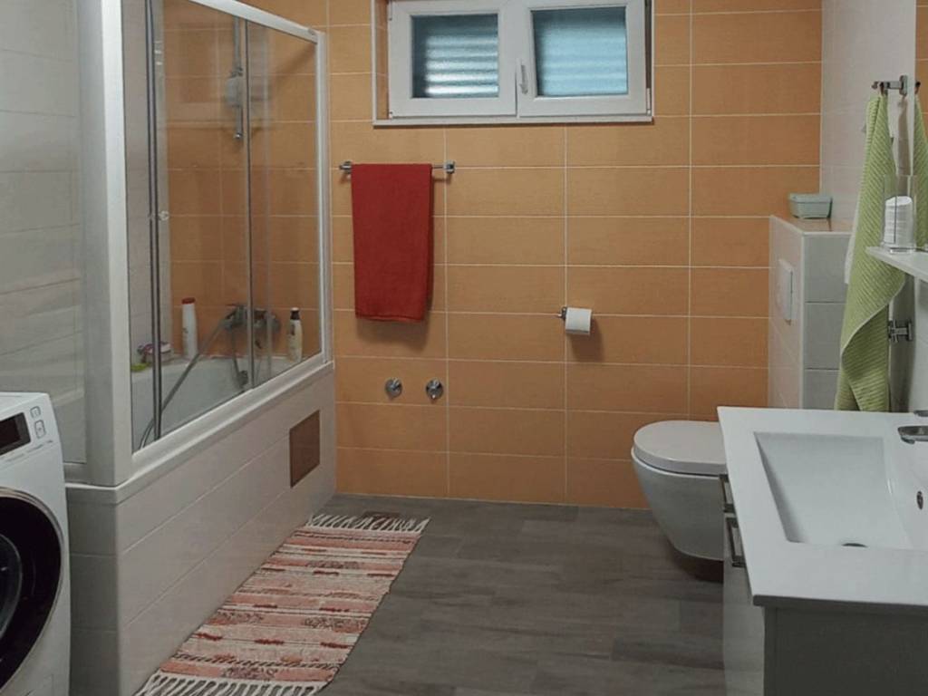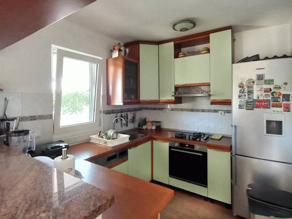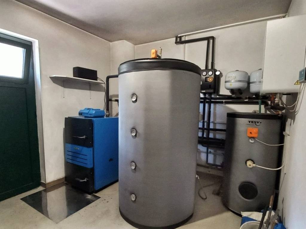The apartment with an area of 115 m2 has three bedrooms, two bathrooms, a terrace of an additional 43 m2, and a utility room with central wood heating (Buderus manufacturer), central electric heating, and a solar panel heated boiler.