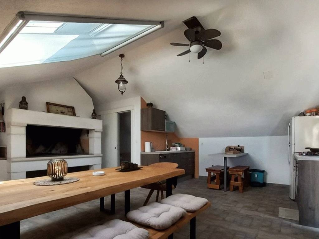 In the yard, there is a well and a fireplace, and next to the building are two storage rooms, each with an area of 2 m2. Above the garage, there is a dining room with a kitchen, a toilet, and a fireplace, with a total area of 26 m2.