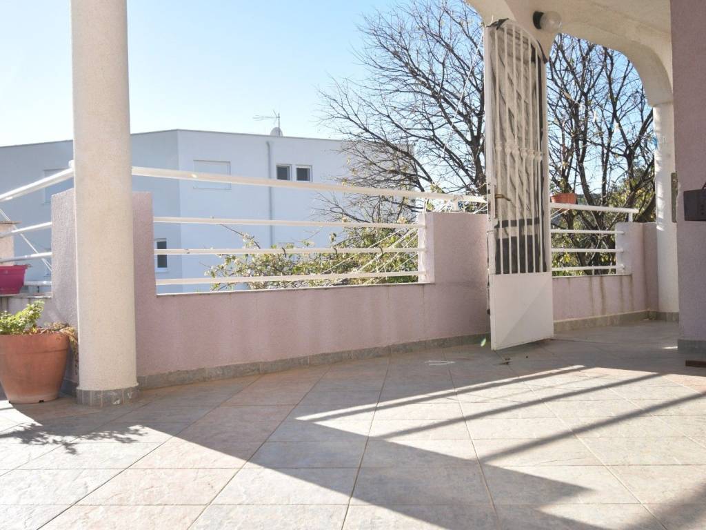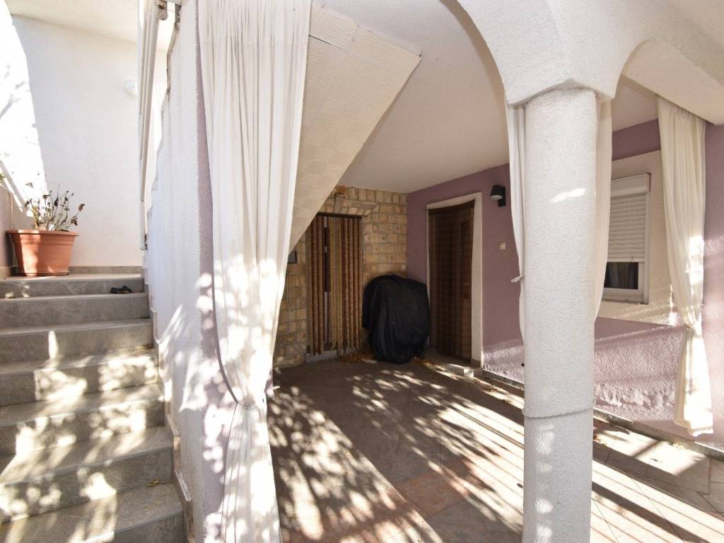 The house is spread over 3 floors. On the ground floor there is a paved covered courtyard where there is one two-room apartment with kitchen and living room/bedroom, pantry, bathroom and one separate bedroom.