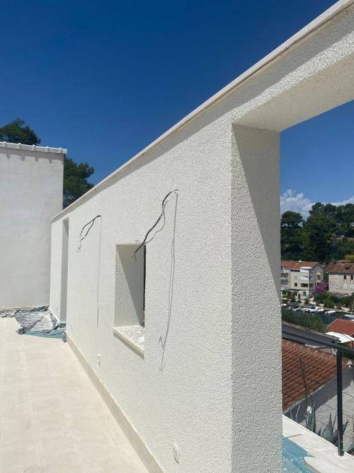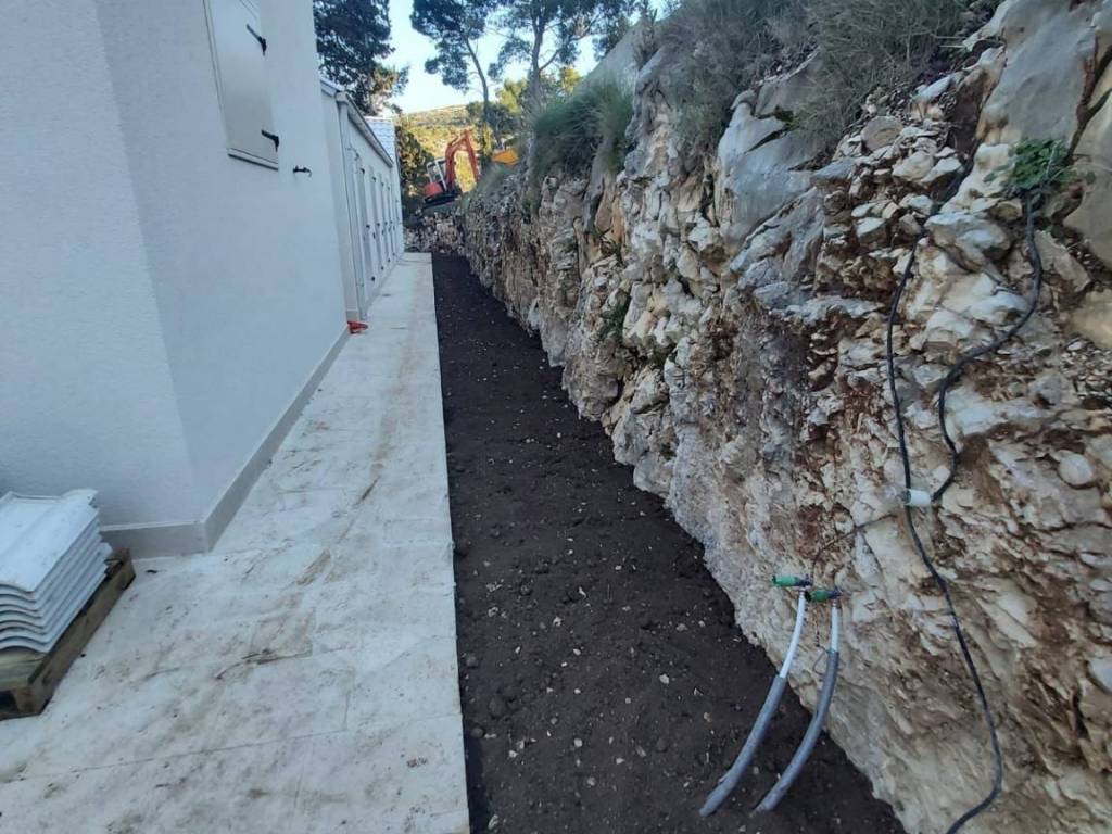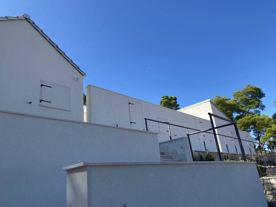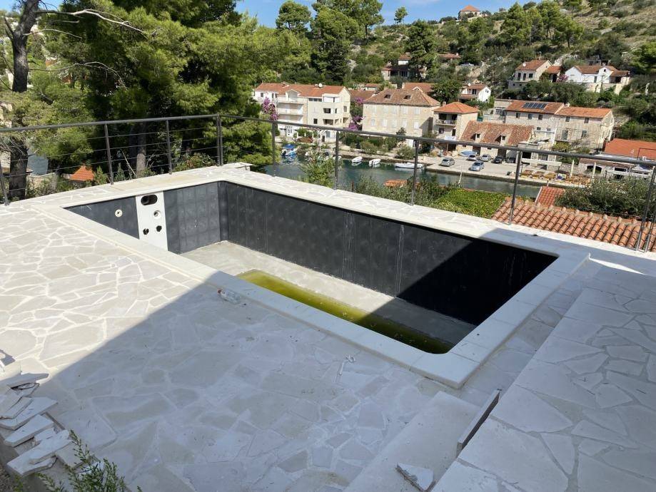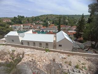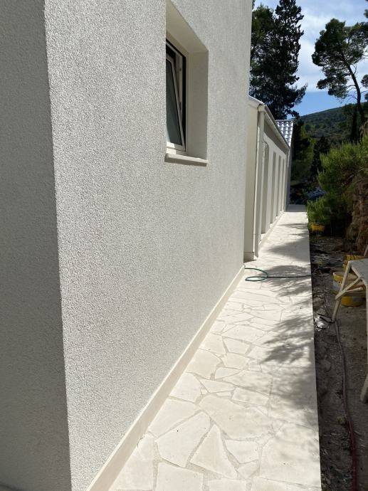 The house combines modern, traditional, and Dalmatian styles, built entirely from Brač stone, inspired by Kaštel Gligo, located on the sunny side of the bay of Bobovišća. Three wings of the complex were created around a spacious courtyard facing the sea, enclosed by a high defensive wall, along which part of the stone walkway on vaults is preserved.