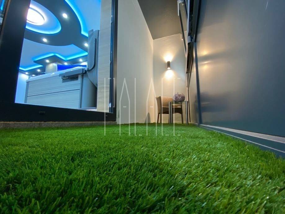 It consists of a hallway, a bathroom with a built-in shower, a living room, a pantry, a bedroom and two closed balconies with artificial grass.