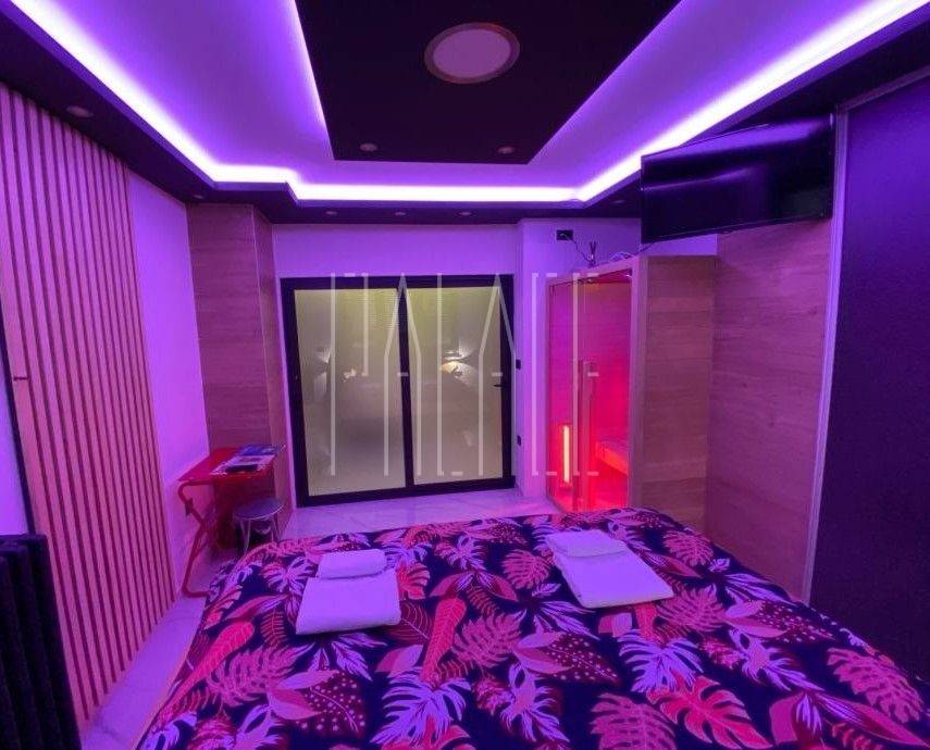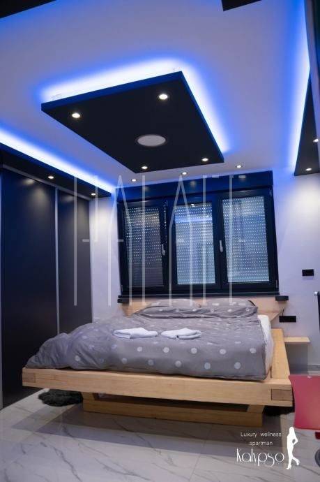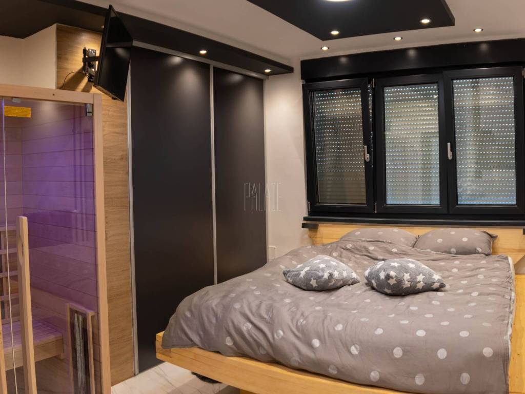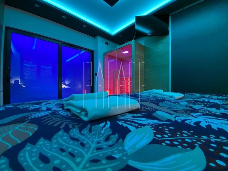 In the bedroom there is an infrared sauna, a massive large double bed handmade from solid wood and ambient LED lighting with Wi-Fi control, which is installed throughout the apartment.