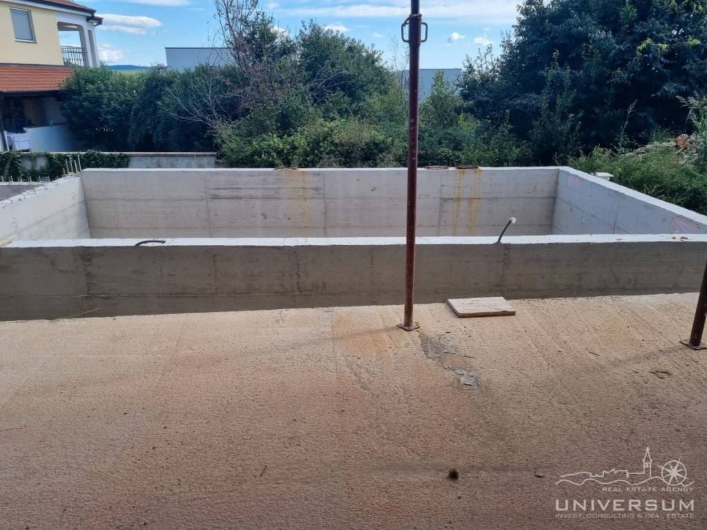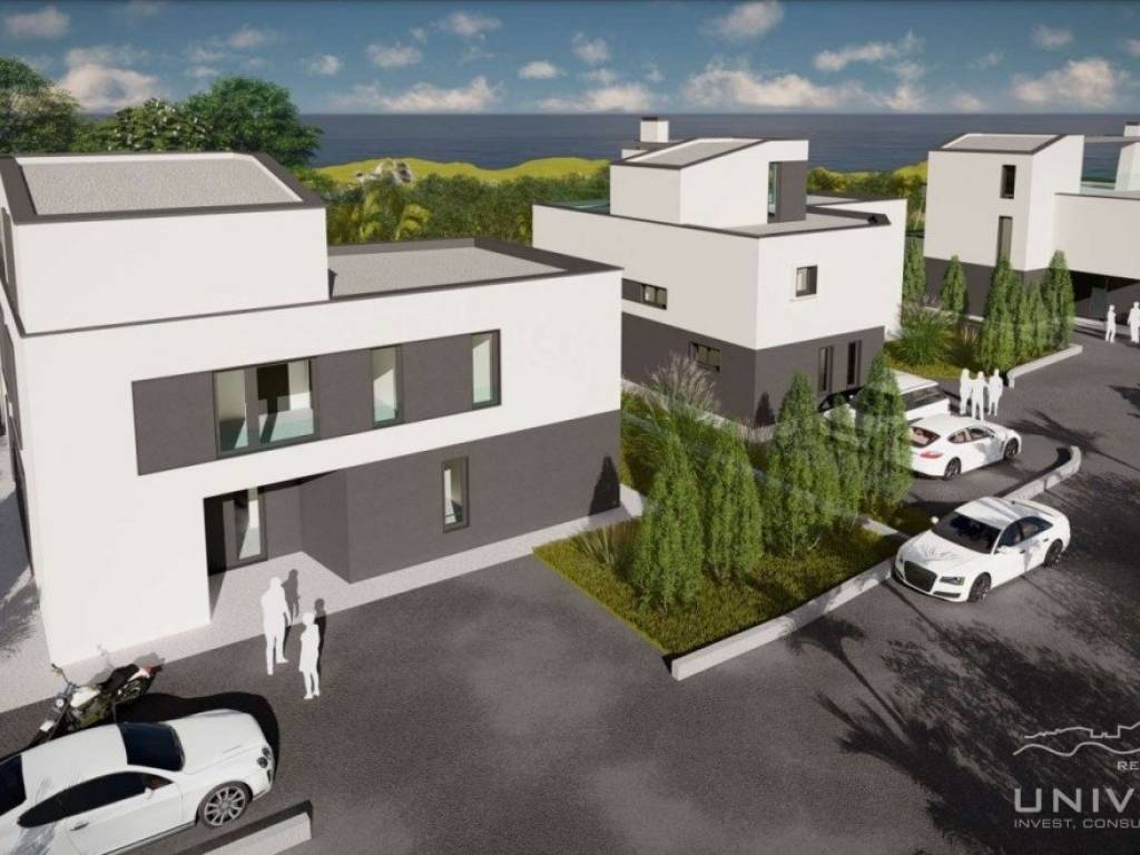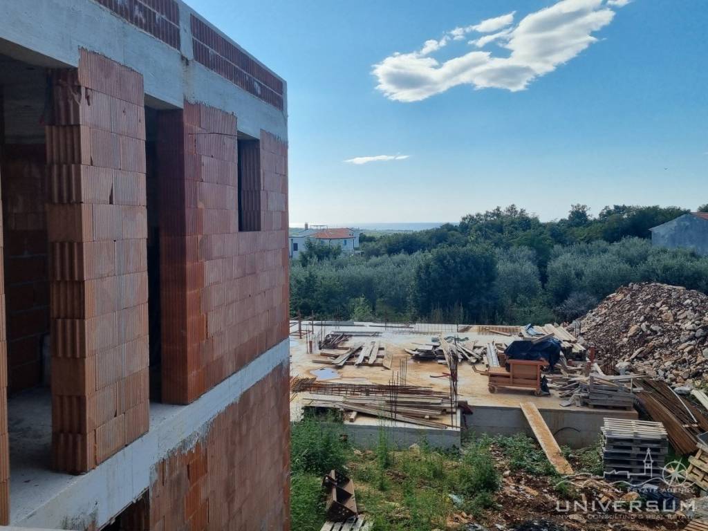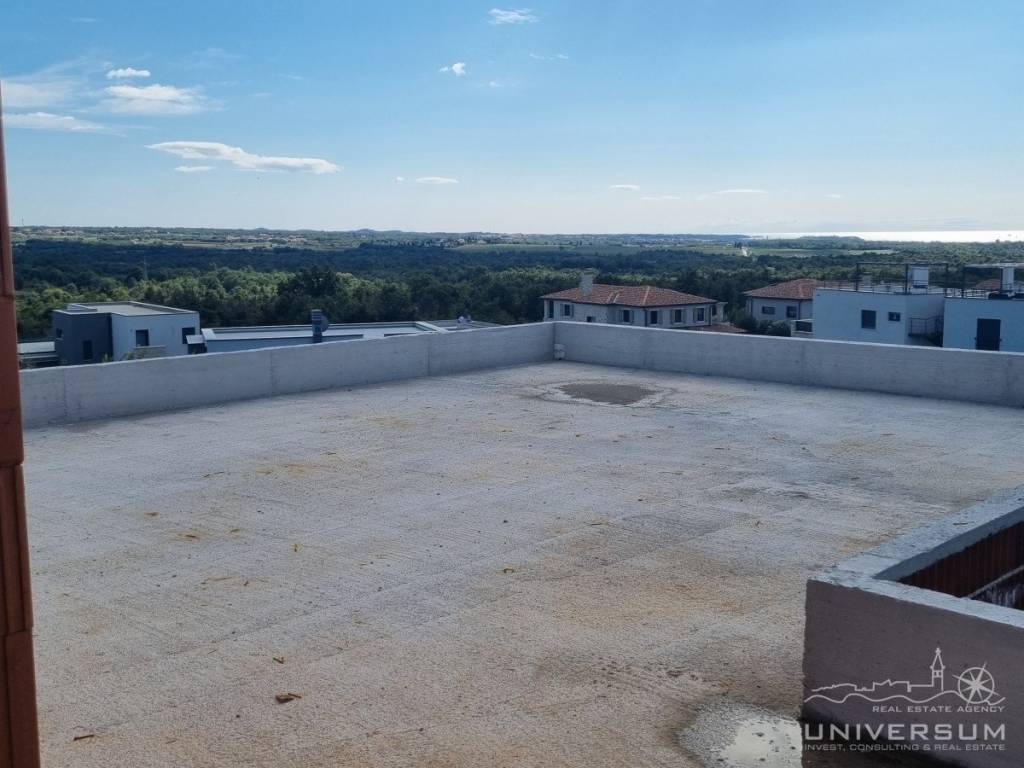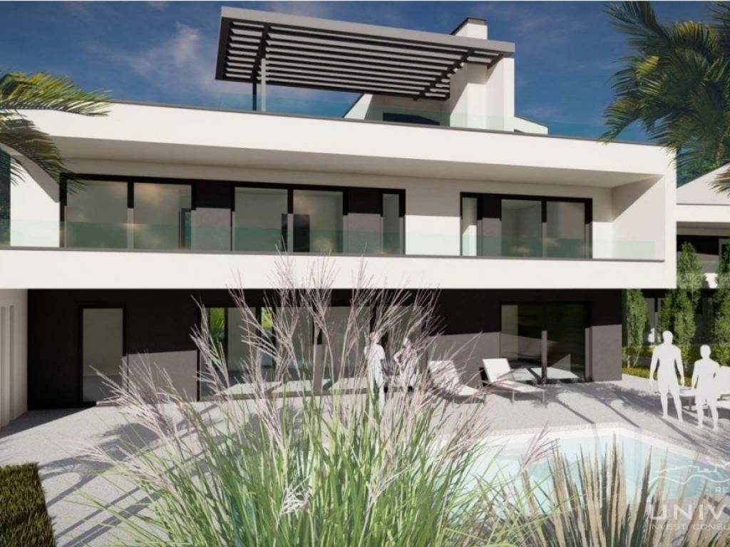 An impressive modern villa for sale with a pool and a sea view near of Poreč. The villa is located in a tourist town not far from Poreč and has all amenities. The net usable area of the villa is 291 m2, while the land area is 676 m2. It extends over three floors. The ground floor of the villa consists of a large open space where there is a living room with a fireplace, a dining room and a kitchen. Also on the ground floor there is a toilet, a laundry room, a study and a wellness area with a sauna. The living room has direct access to a large covered terrace, swimming pool with sunbathing area and fenced land.