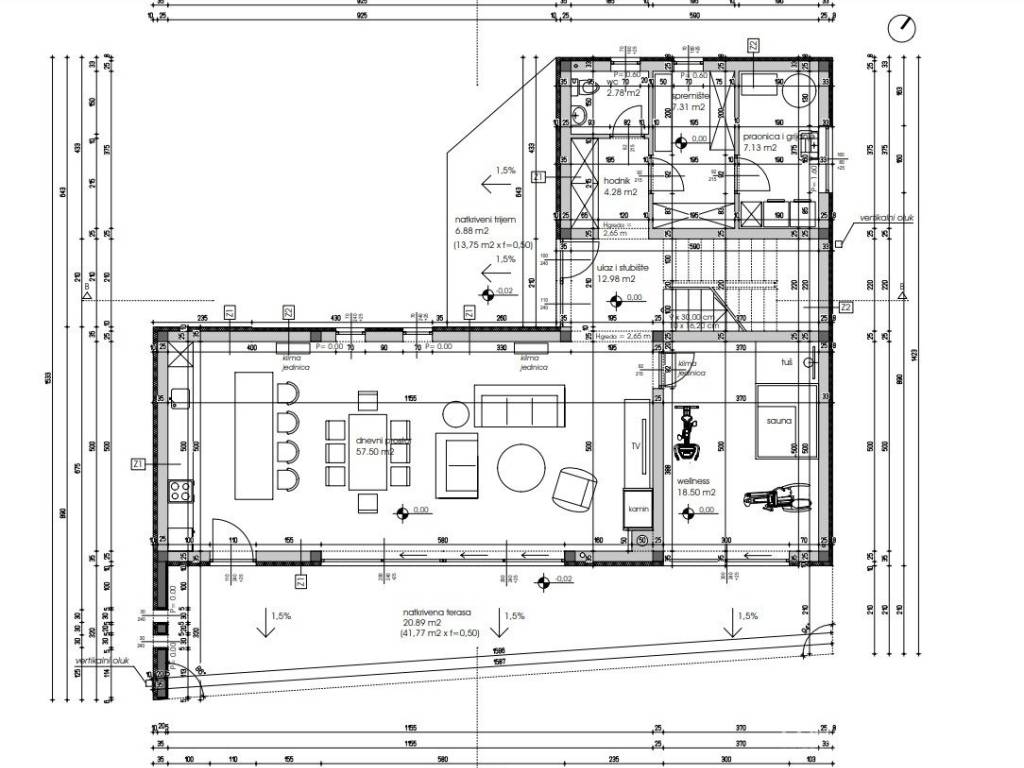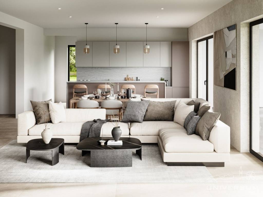 the living room, while cooling is provided by air conditioners (all rooms). The carpentry is aluminum with three-layer glass, while the facade is energy-efficient, which ensures low heating and cooling costs. The villa is built with top-quality materials - 25 cm porotherm bricks, ceramics and first-class parquet floors, as well as sanitary facilities.