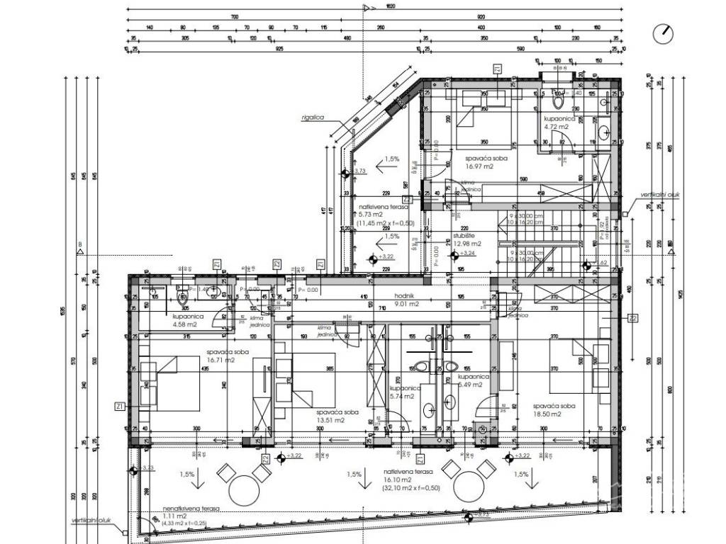 On the first floor there are 4 bedrooms, each with its own bathroom. Three bedrooms have access to a large terrace with a panoramic view of the sea and nature.