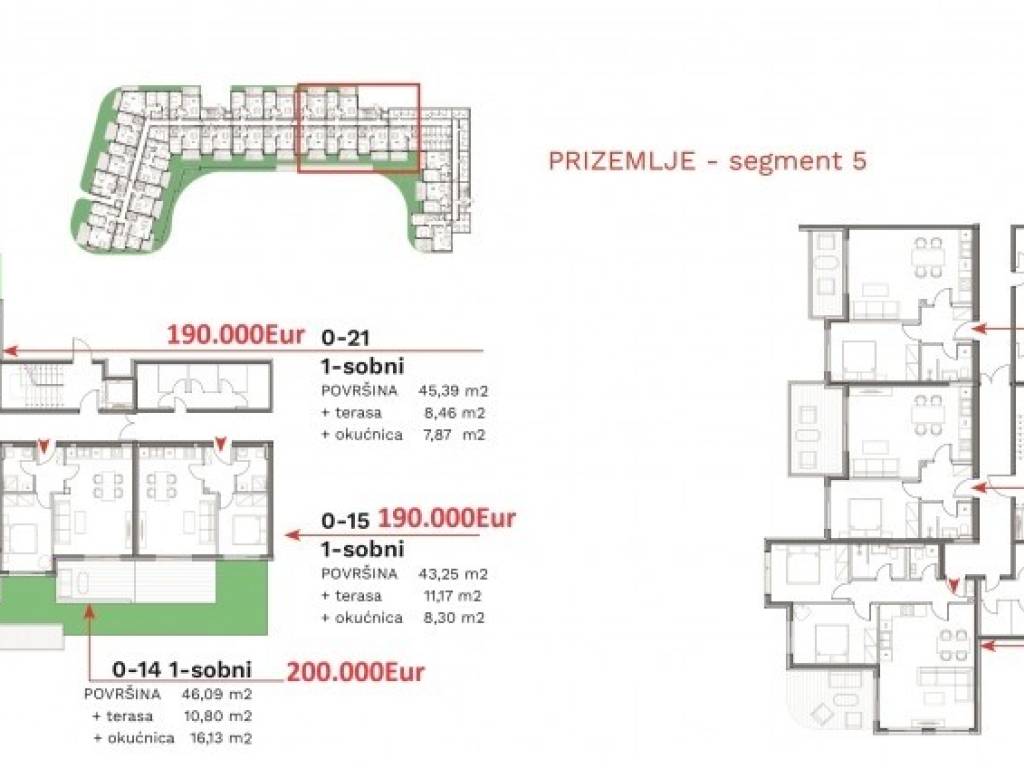Description of the building: It consists of four entrances and a total of 122 apartments - of different layouts and square footage. The project offers a variety of studio, one-bedroom (+ living room), two-bedroom (+ living room) and three-bedroom (+ living room) apartments - vertically connected with elevators and stairs from the parking floor to the entrance to the apartments. Modern and comfortable apartments also have spacious balconies, loggias and/or terraces with a garden, which provide high quality housing in a unique location near all amenities.