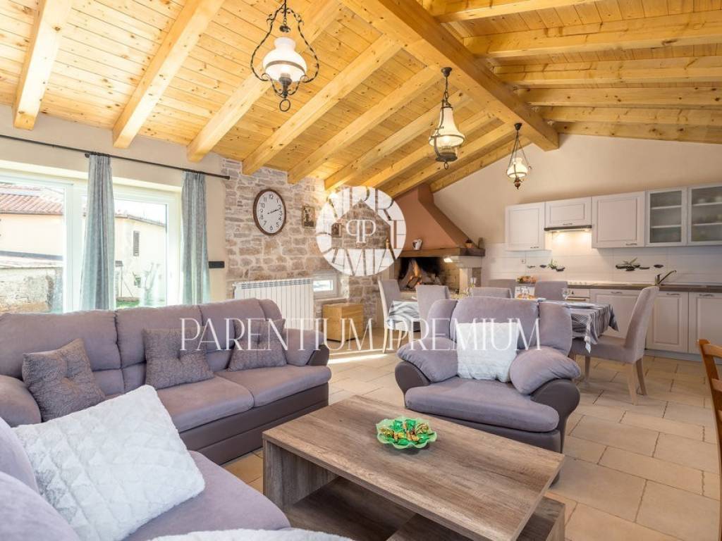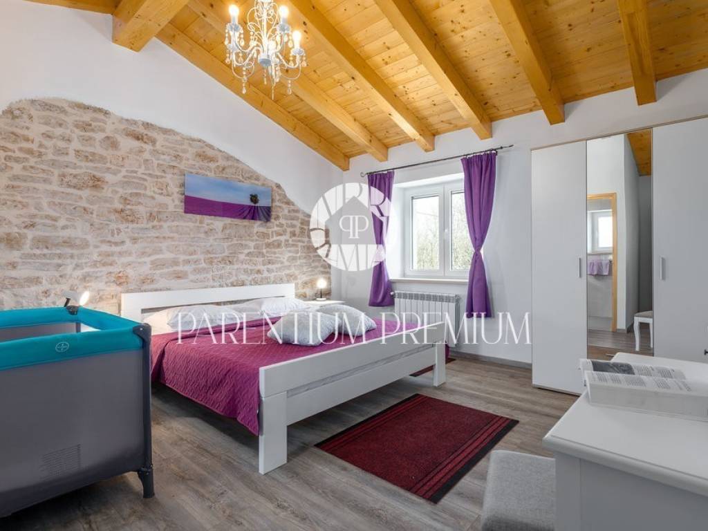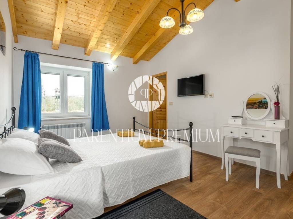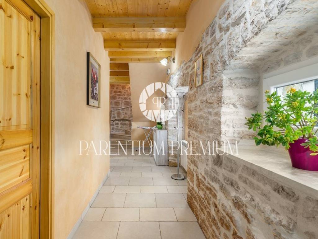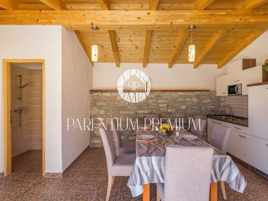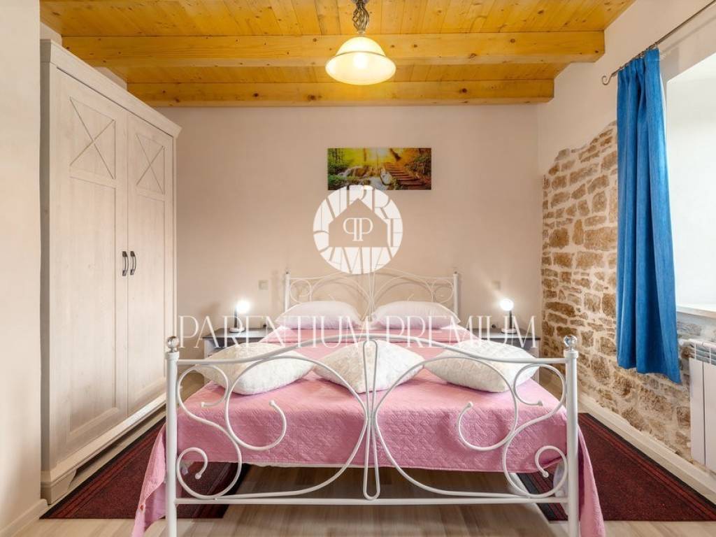 A renovated stone house for sale in a quiet village 17 km from the first beaches. The house of 150 m2 is located on a plot of land of 985 m2. It is spread over two floors, of which the ground floor consists of a spacious living room with a kitchen and dining room with a brick fireplace, two bedrooms and one bathroom. On the first floor of the house there are two more bedrooms, each with its own bathroom. The house was completely renovated in 2020 and the original stone has been preserved as much as possible, which gives the house a special atmosphere. The house is heated by oil-fired central heating and a wood-burning fireplace in the living room. The house is currently rented out in the summer months so that the future owner can only continue the already well-established business.