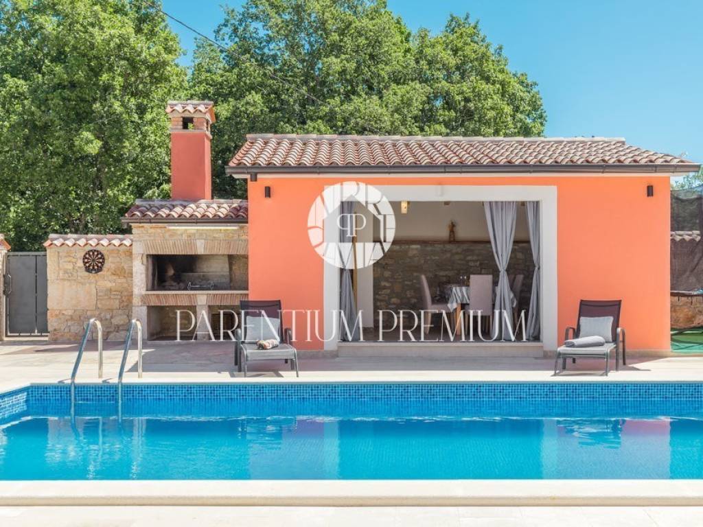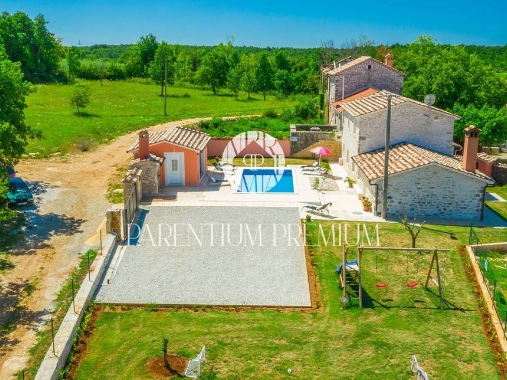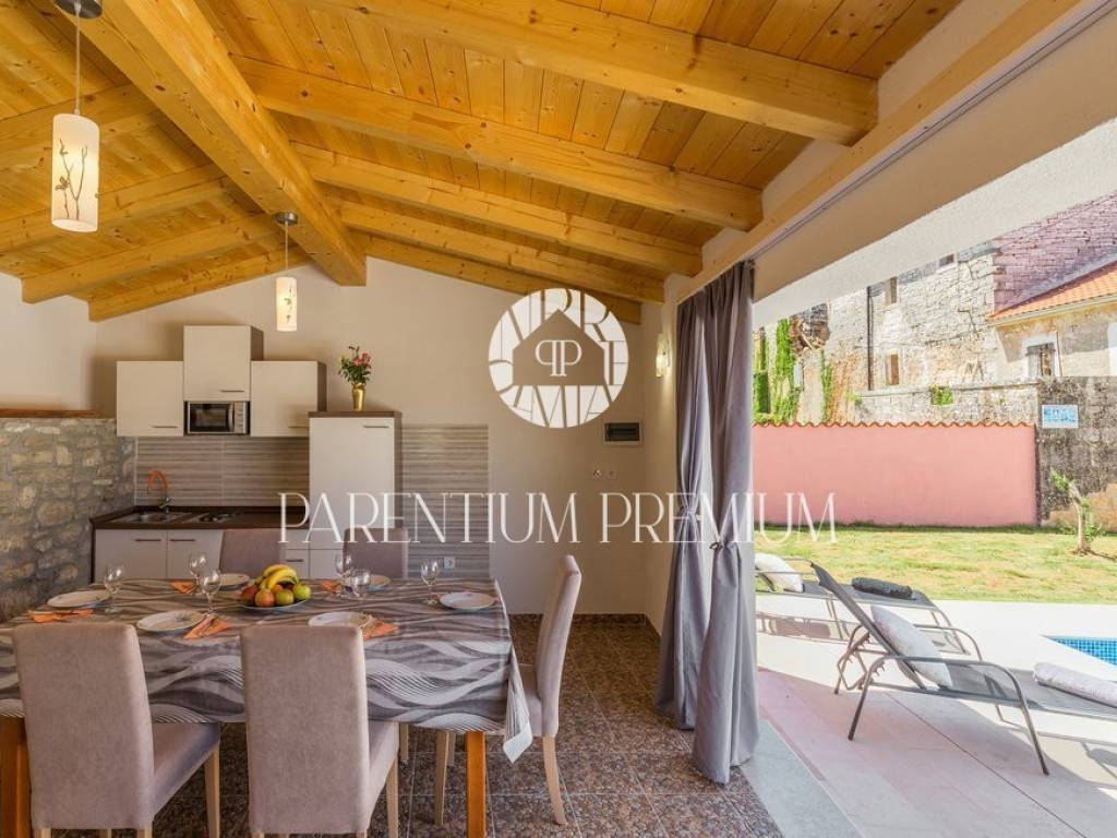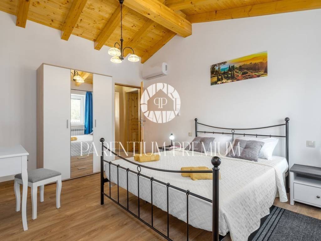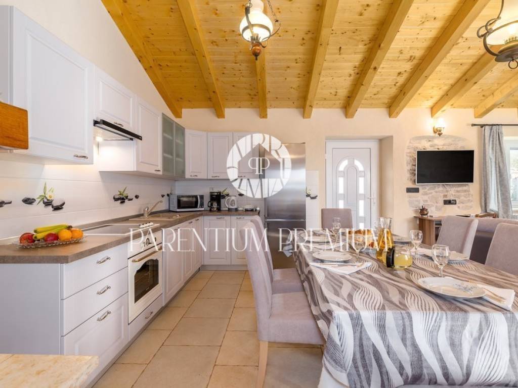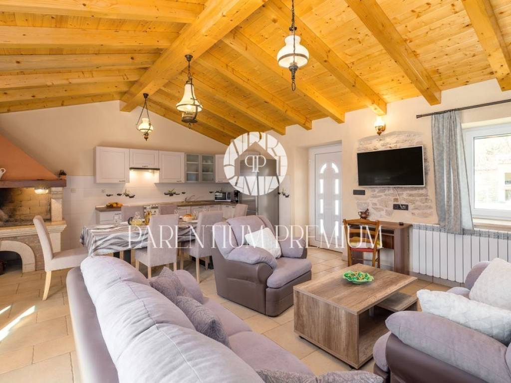 A renovated stone house for sale in a quiet village 17 km from the first beaches. The house of 150 m2 is located on a plot of land of 985 m2. It is spread over two floors, of which the ground floor consists of a spacious living room with a kitchen and dining room with a brick fireplace, two bedrooms and one bathroom. On the first floor of the house there are two more bedrooms, each with its own bathroom. The house was completely renovated in 2020 and the original stone has been preserved as much as possible, which gives the house a special atmosphere. The house is heated by oil-fired central heating and a wood-burning fireplace in the living room. The house is currently rented out in the summer months so that the future owner can only continue the already well-established business.