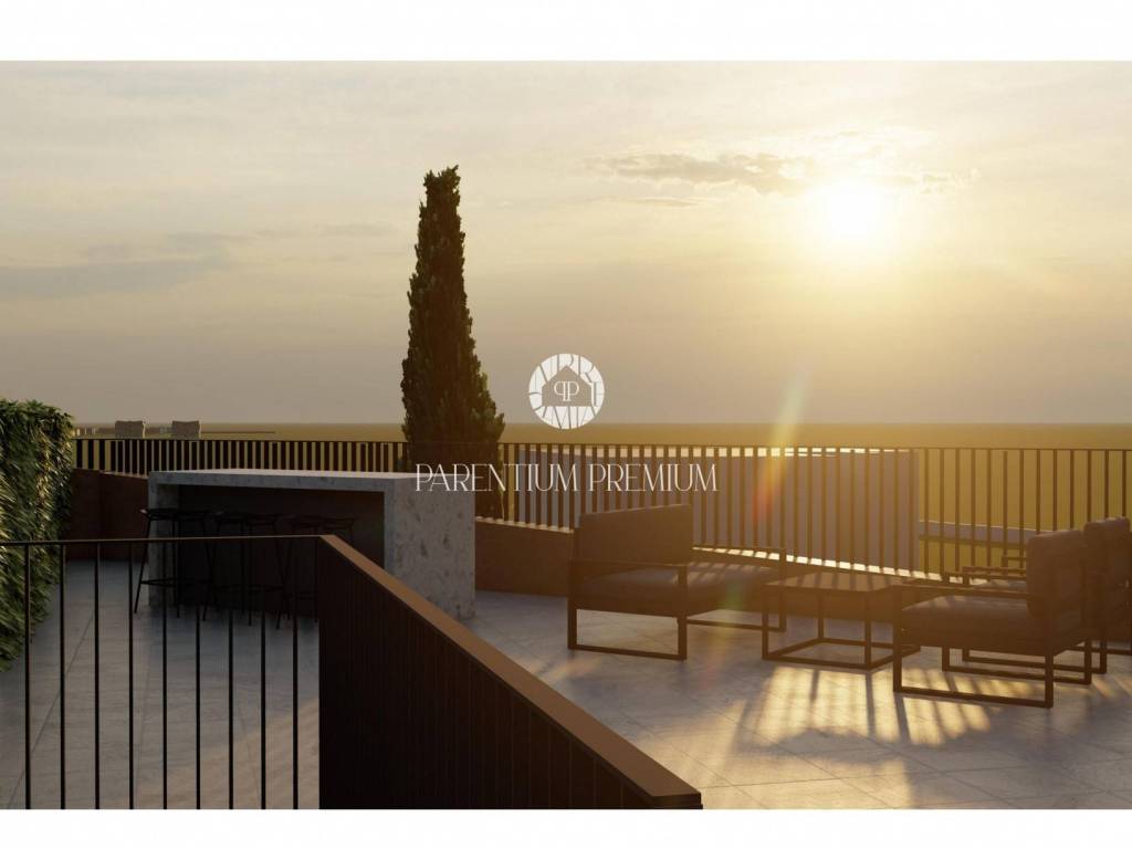 An internal staircase leads to a spacious private roof terrace with pre-installed connections for a jacuzzi and a summer kitchen, ideal for creating a sunbathing area or a relaxing lounge zone.