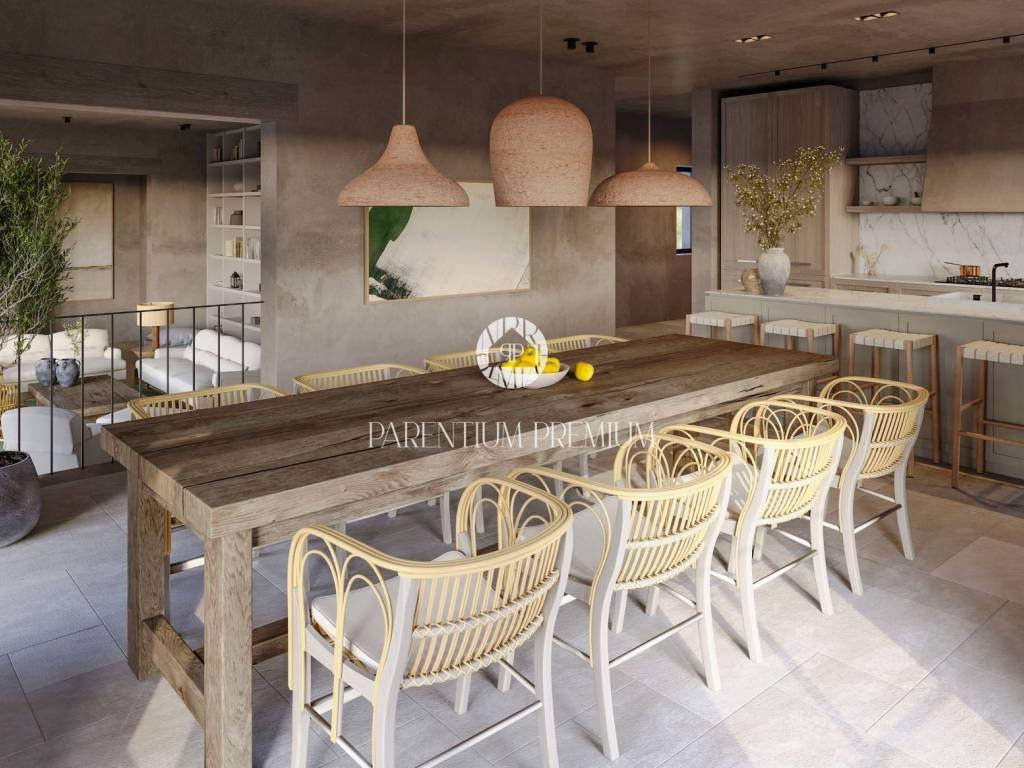 The outdoor area will include a 45 m skimmer pool with a sun deck, a summer kitchen, pergolas, and three parking spaces, all beautifully landscaped with Mediterranean greenery.