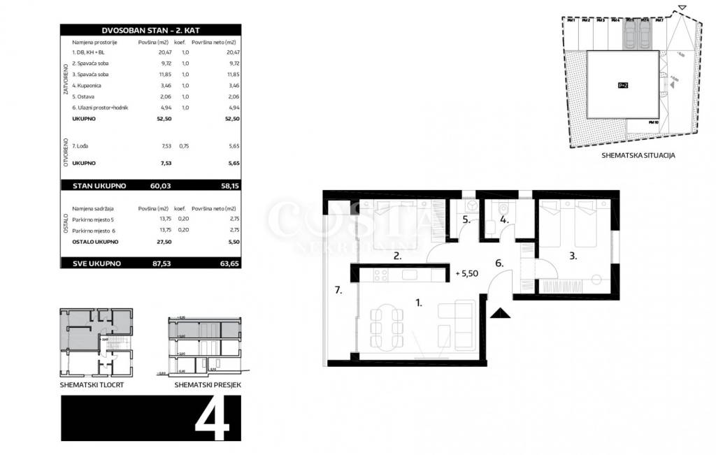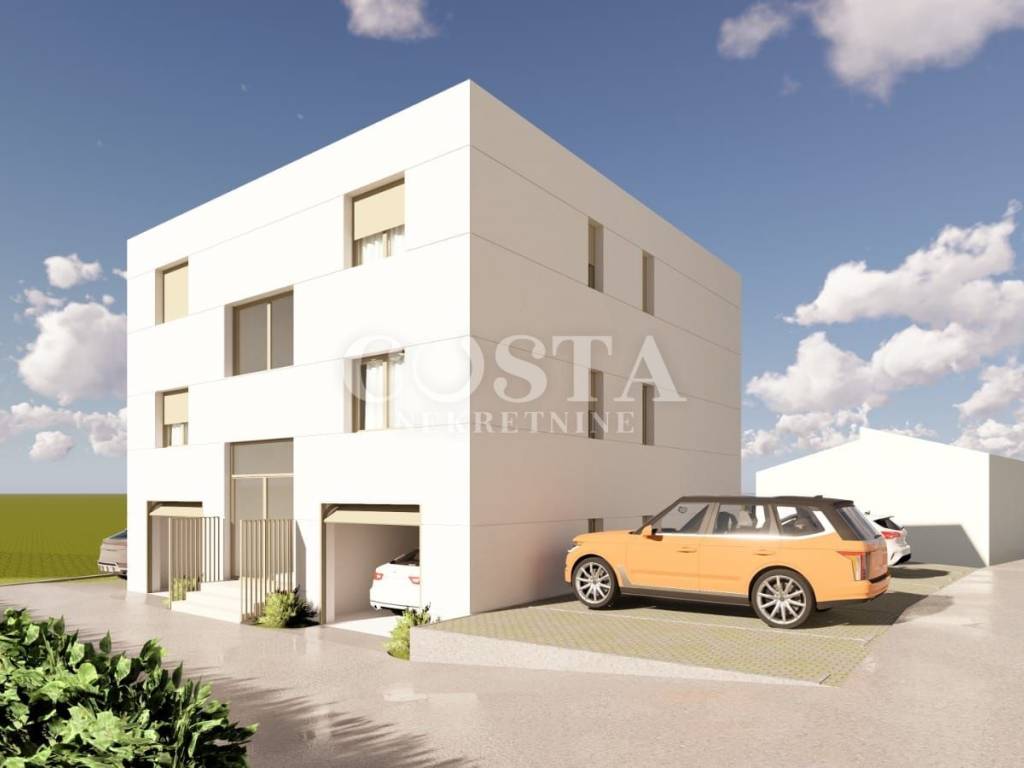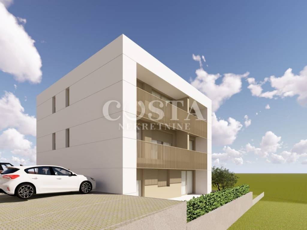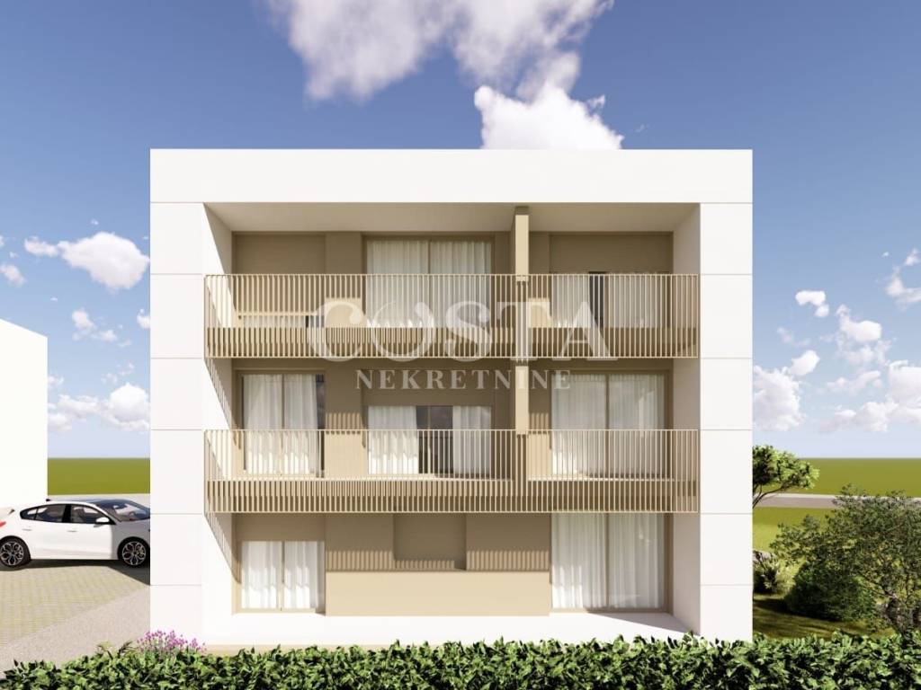 A modern apartment under construction in Diklo, Zadar is for sale. The apartment with a living area of ​​52.50 m2 is located on the second floor of a smaller residential building with five units. It consists of two bedrooms, a kitchen and living room, a bathroom, a wardrobe and a hallway. The apartment is air-conditioned, and underfloor heating is installed in the bathroom. The apartment also has a loggia of an additional 7.53 m2, and two parking spaces in the building's courtyard. The total usable area of ​​the apartment, including the annexes, is 87.53 m2 (K.V. 63.65 m2).