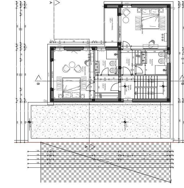 The staircase leads to the first floor, where there is a wardrobe, a bedroom, a bathroom, and a loggia on one side, and another wardrobe, a bedroom, and a bathroom on the other.