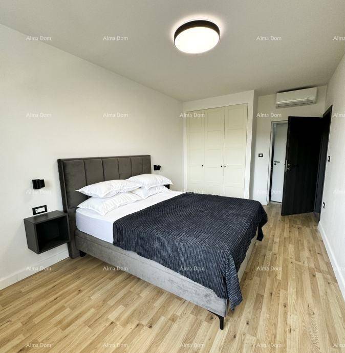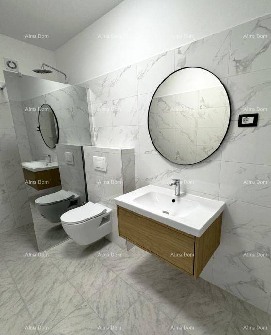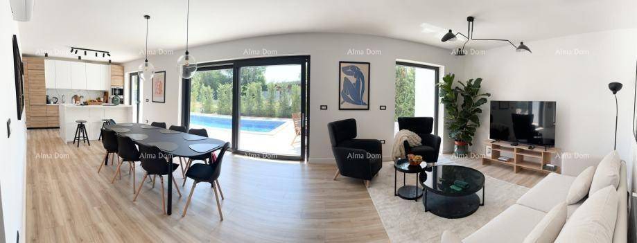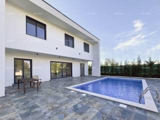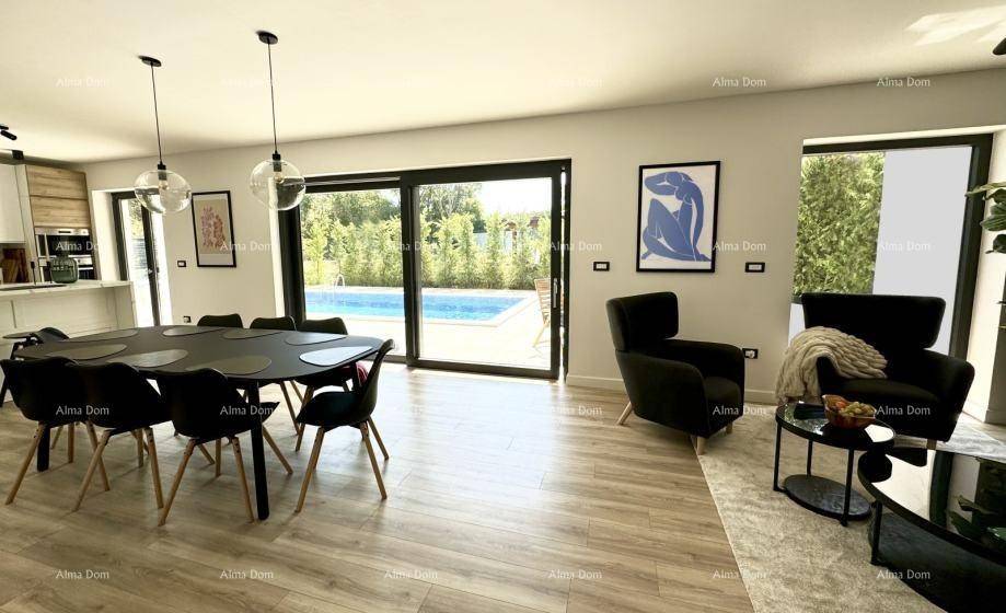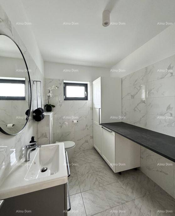A beautiful duplex house of 178 m2 is for sale, Rovinjsko selo. The house is partially furnished, it is composed on the ground floor of an open space living room with dining room and kitchen, bathroom/laundry room, entrance area, storage room by the entrance and storage room by the kitchen, on the first floor there are three bedrooms, each with a private bathroom. The house has a swimming pool, two parking spaces, 350 m2 garden.