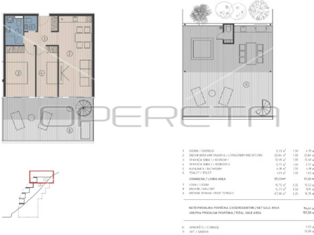 JESENICE - NEWLY BUILT APARTMENTS Penthouse 401 is for sale in a new building not far from Split in Krilo Jesenice. It consists of a hallway, a living room with a kitchen and a dining room, 2 bedrooms, a bathroom, a toilet, a loggia, a balcony and a beautiful roof terrace. The apartment has a garden and a storage room. There is a possibility to buy a parking space for 30,000 EUR.