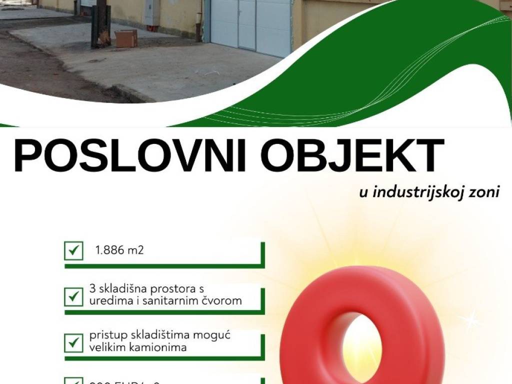 Poslovni objekt sastoji se od tri skladišna prostora, svaki skladišni prostor ima pripadajući uredski prostor i sanitarni čvor, ukupne kvadrature 1.886 m2:
