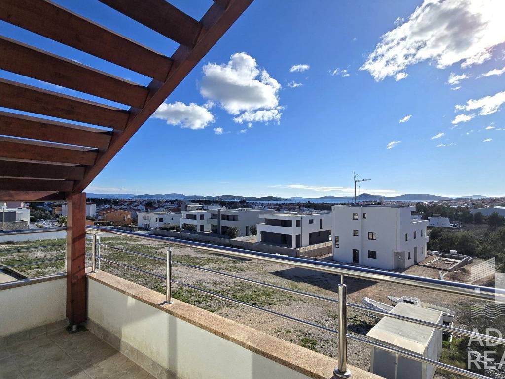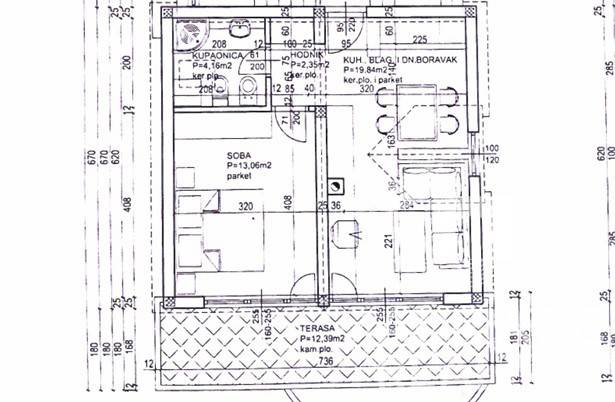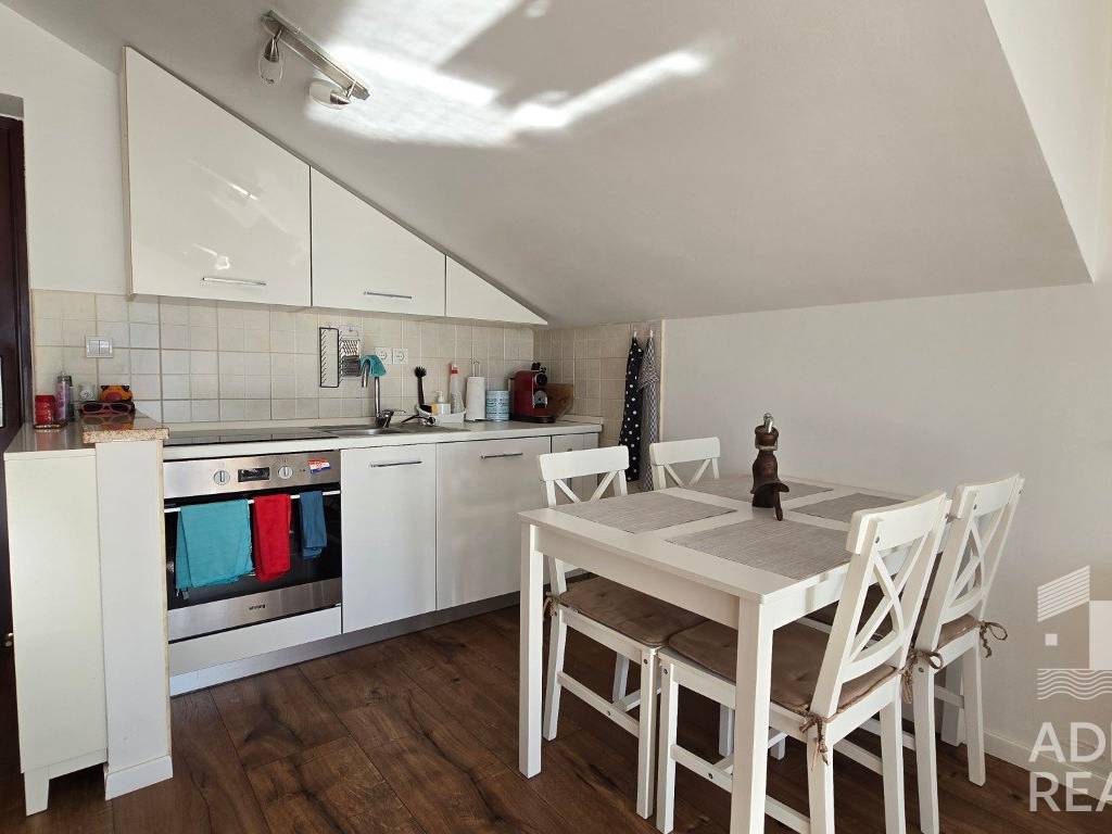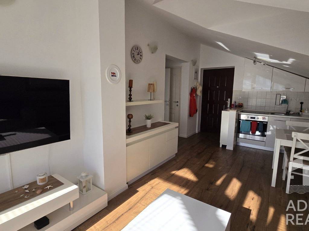 It is situated on the second floor of a smaller residential building and consists of an entrance area, an open-plan kitchen, dining area and living room, one bedroom, and a bathroom. Both the living room and the bedroom have access to a terrace offering a pleasant sea view.