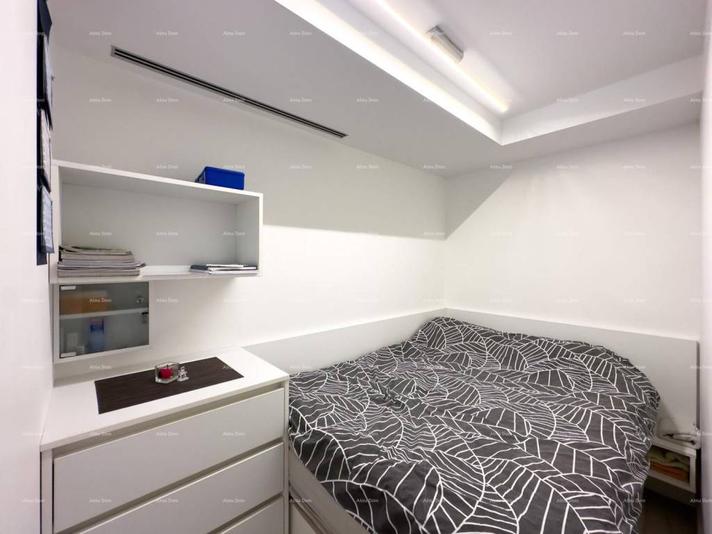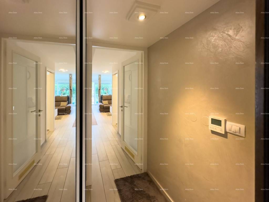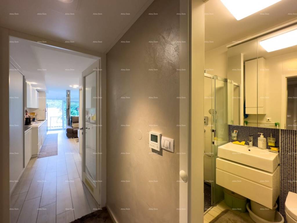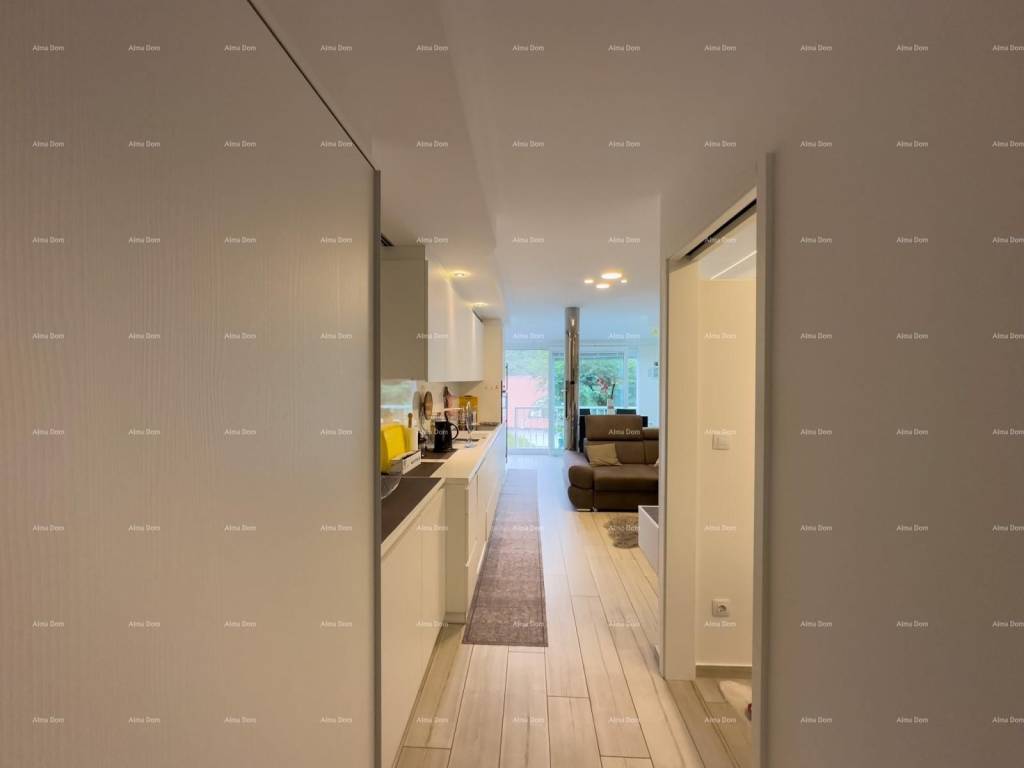 The apartment has been completely renovated down to the last detail three years ago. It consists of one bedroom, a bathroom, a kitchen, a dining area, and a living room that opens up to a small garden. There is underfloor heating in the bathroom, and the rest of the apartment is heated and cooled by a central air conditioning unit. The apartment is fully furnished with custom-made furniture and is sold as is.