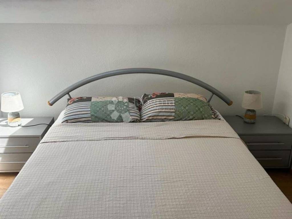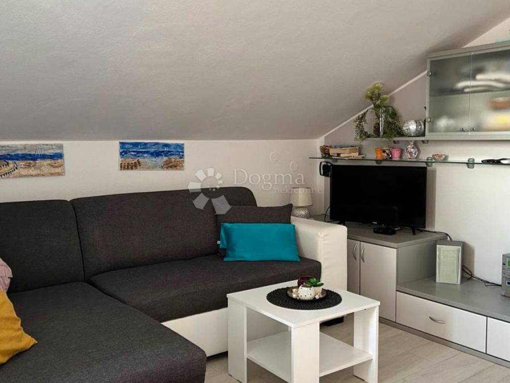 An apartment is for sale in Povljana, located in the high attic of a residential building. This smaller, charming apartment with an internal living area of 44.15 m consists of a bathroom, two bedrooms, and a kitchen with a living room that provides access to a private terrace with a gross area of 9 m, offering a beautiful sea view.