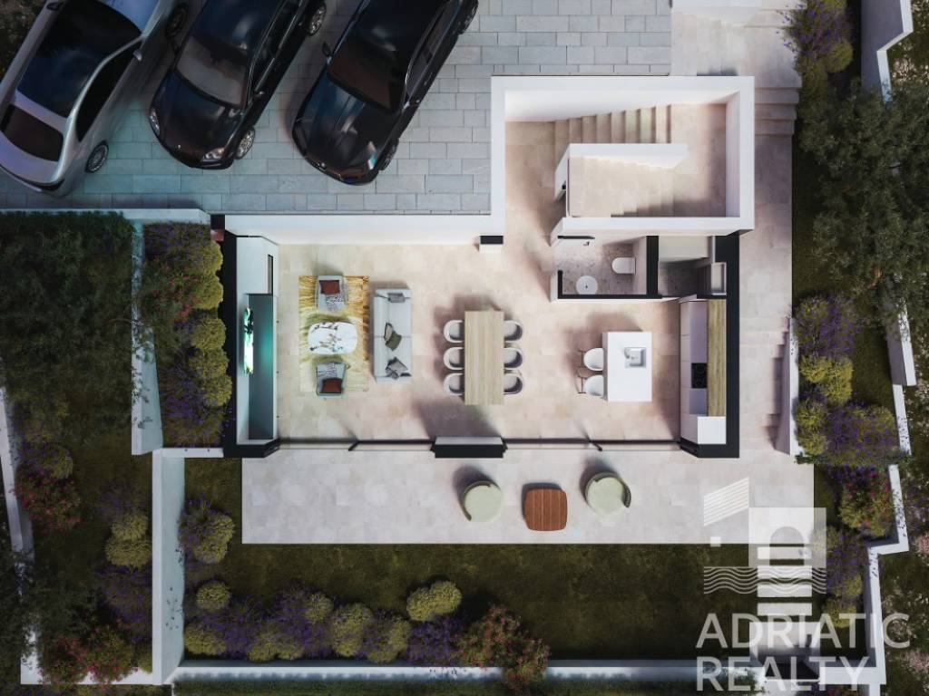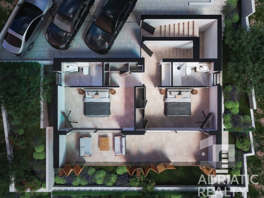 The upper floor (enclosed living area of 48.87 m2) consists of two comfortable bedrooms, each with its own bathroom and access to a loggia (22.68 m2) offering a sea view, providing an added sense of luxury and privacy.