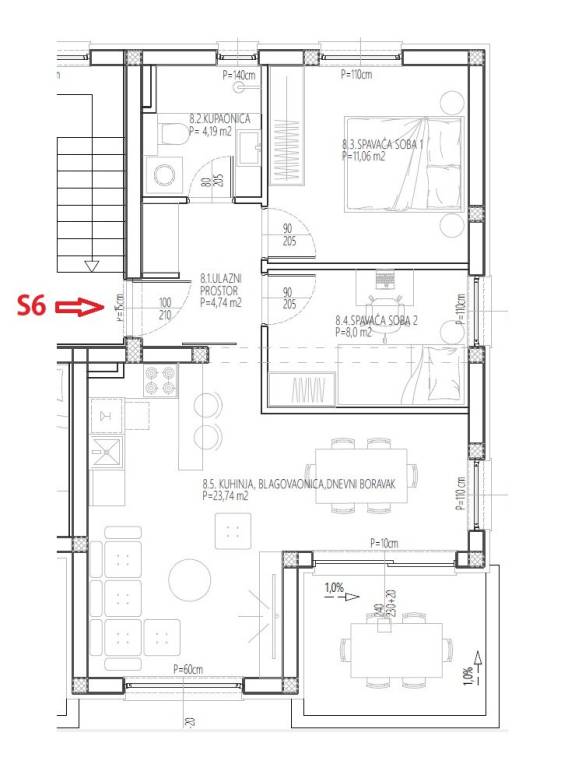 APARTAMENTO S6 tiene 60,76 m2 de superficie útil neta con coeficientes incluidos, y consta de: entrada, 2 dormitorios, baño, cocina y comedor, sala de estar, terraza, y 1 plaza de aparcamiento. El precio es de 200.000 € (El comprador está exento del pago del 3% de impuesto sobre transmisiones patrimoniales).
