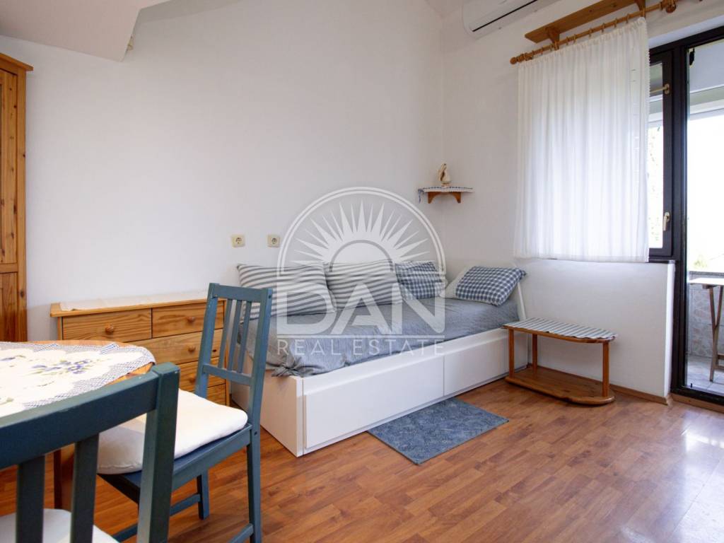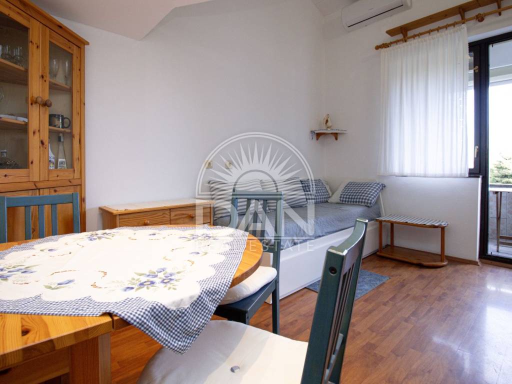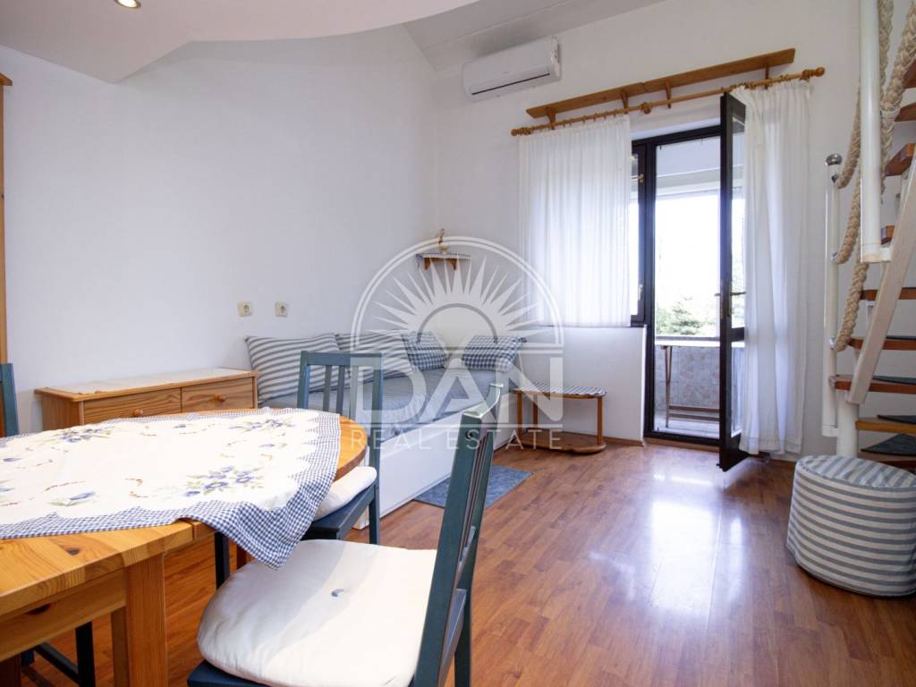 The first floor consists of an entrance hall, kitchen, bathroom, living room, and a small loggia, while the second floor features a bedroom. The space is very well utilized and offers everything needed for a comfortable stay, especially during the summer months. Heating and cooling are provided by an air conditioning unit.