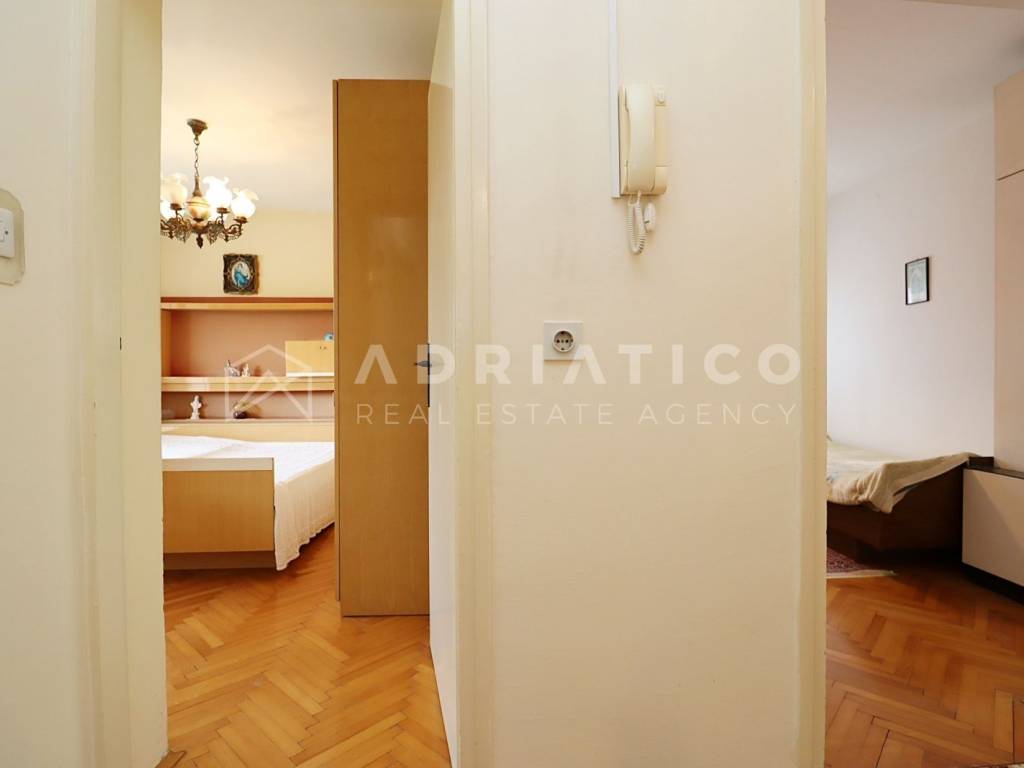 The apartment consists of a spacious entrance hall, corridor, one smaller and one larger bedroom with access to the terrace, a kitchen with dining area, a large living room with access to the terrace, a bathroom, and an additional storage room on the ground floor of the building. Thanks to its orientation, the apartment is filled with natural light throughout the day, creating a pleasant and warm atmosphere.