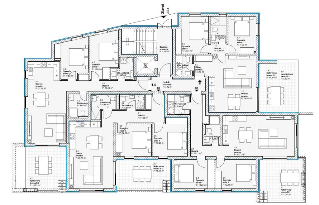 El apartamento S1 con una superficie total de 74,78 m2 consta de entrada, aseo/lavadero, pasillo, baño, dos dormitorios, cocina con comedor y sala de estar, además de una terraza parcialmente cubierta de 19,71 m2. Al apartamento le corresponde una parte correspondiente del jardín, trastero en el sótano y una plaza de aparcamiento.