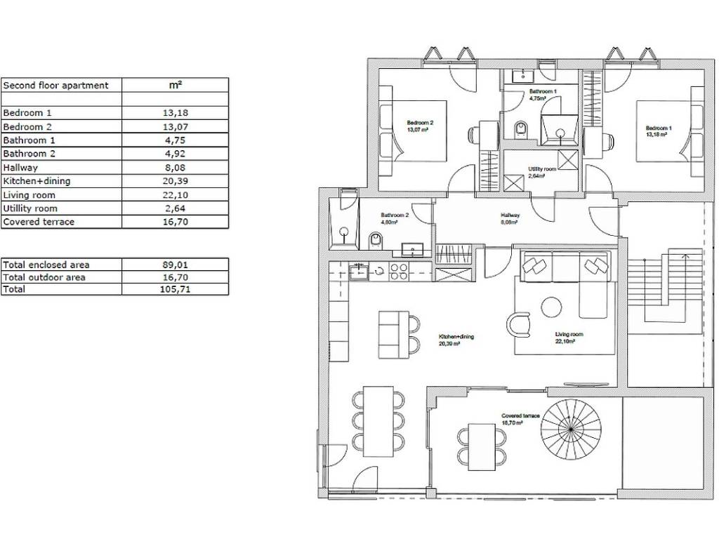 The apartment on the first floor is similarly designed. It includes 80m2 of living space and 27m2 of outdoor space in the form of a covered terrace.
