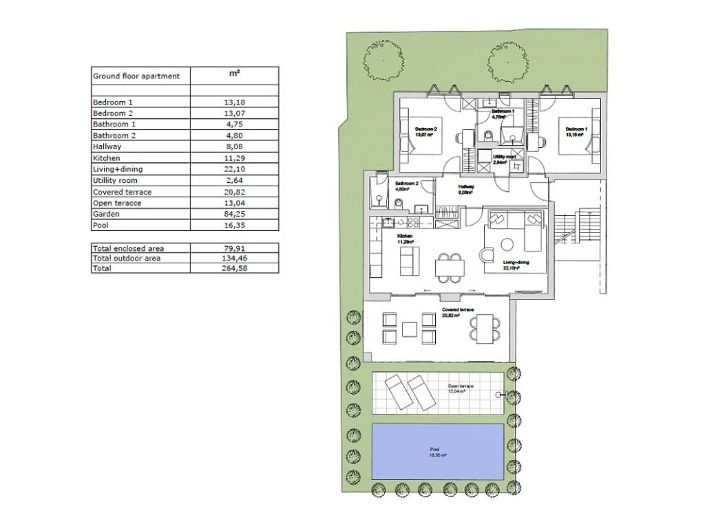 The apartments are separated from each other, with separate entrances connected by an external staircase. All three apartments have two bedrooms, two bathrooms and an open-concept living area. The first apartment, located on the ground floor, includes a living area of 80m2 and a 135m2 garden with a balcony and a sundeck.