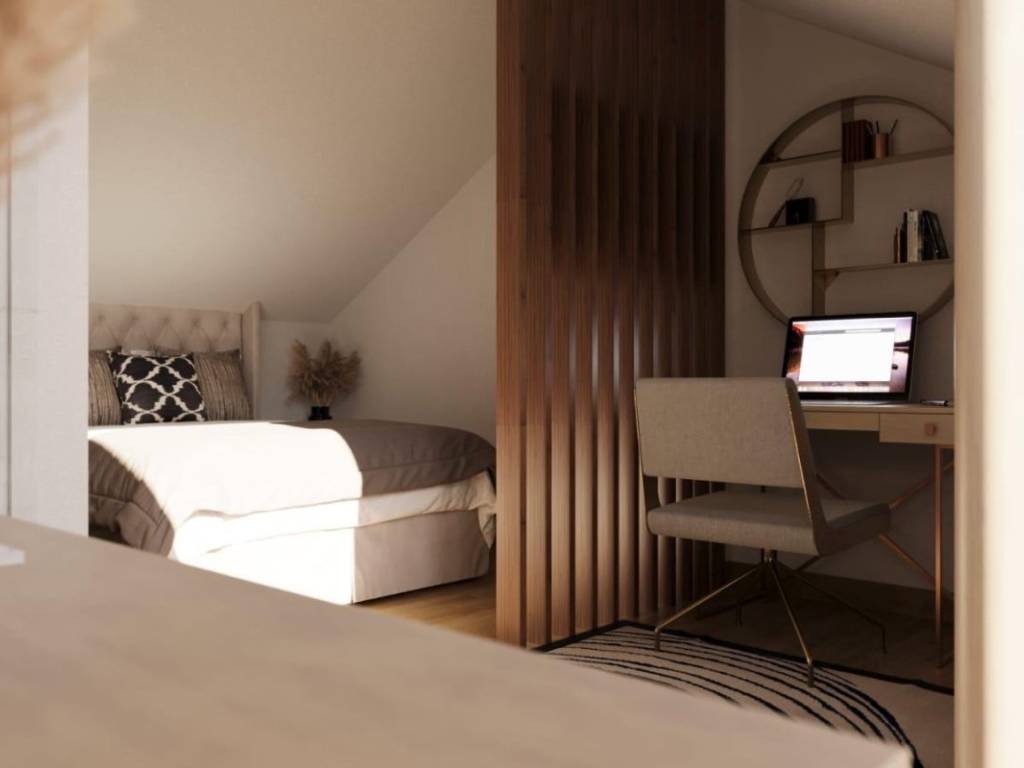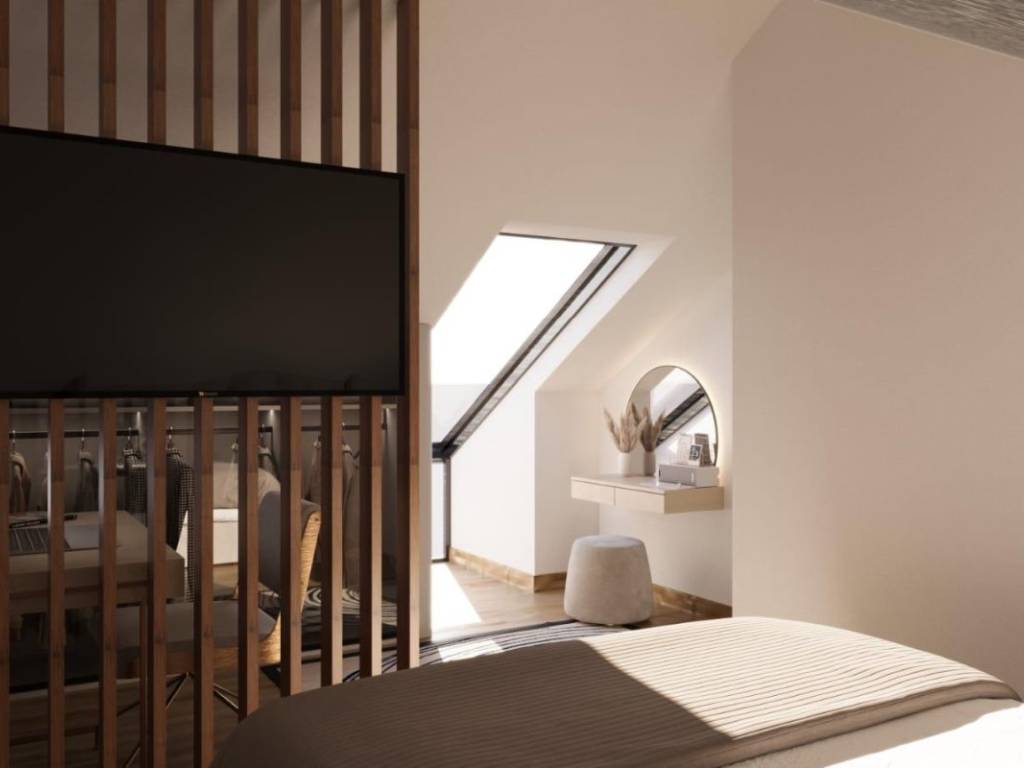 The apartment has an ideal southwest orientation and has 78,60 m of internal living space. On the second floor there is a bathroom and a living area consisting of a kitchen, dining room and living room with access to a terrace of 11,50 m, while an internal staircase leads to the attic where there are two spacious bedrooms. The rooms are carefully arranged to maximize the use of space, and natural light fills the interior throughout the day. The terrace provides a pleasant place to relax with a beautiful view of the sea.