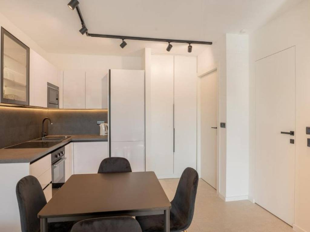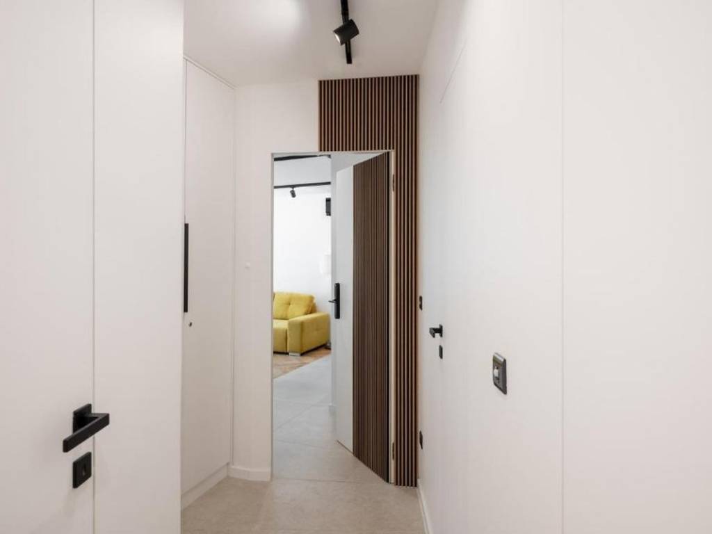 The interior has been designed with attention to detail, combining contemporary design with functionality. Both units are located on the second floor of a residential building, with a total area of 99.32 m2, with an orientation to the north and west. The apartment is divided into two separate apartment units, with an entrance hallway connecting them and leading to an additional bathroom, laundry room and additional bedroom.