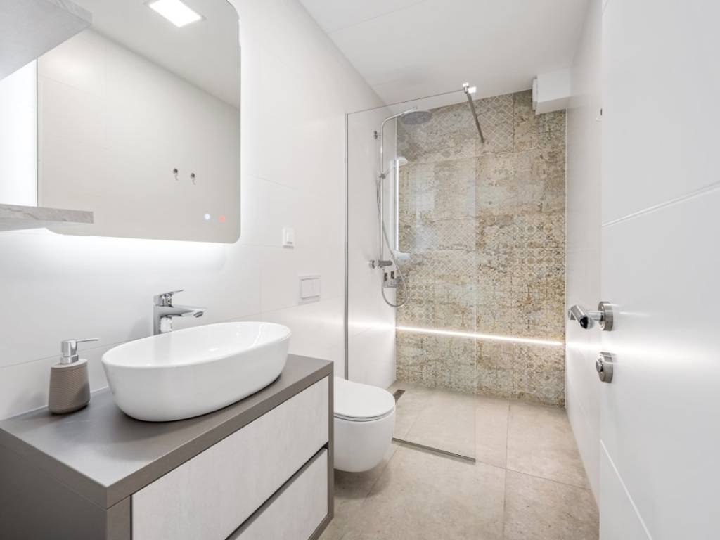 On the first floor on the ground floor there are four bedrooms, each with its own bathroom, a living room with kitchen, bathroom and wellness and sauna.
