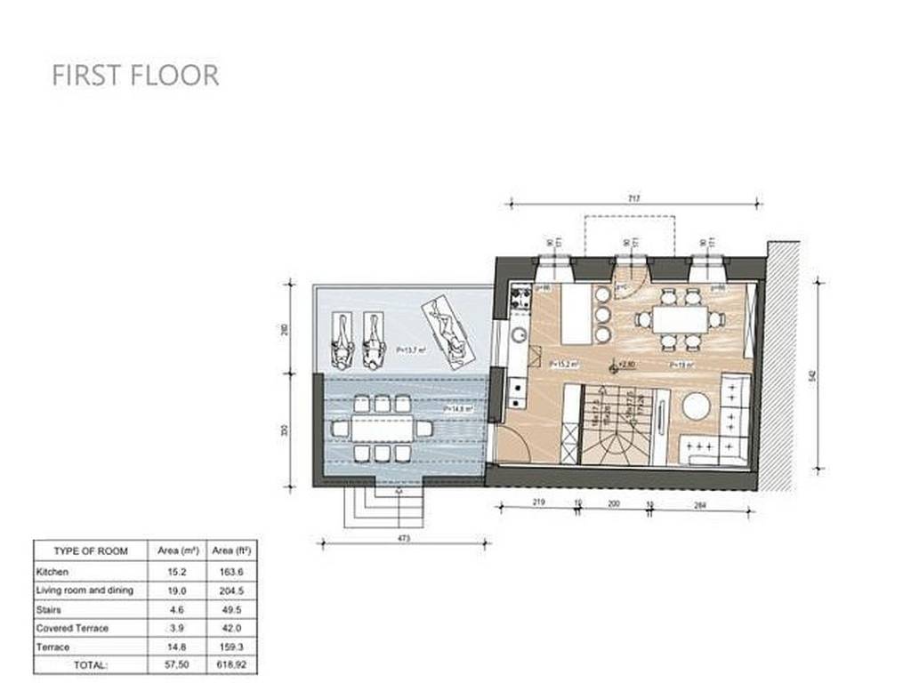 Ground floor (57,50 m): open-concept kitchen and living room with access to a covered terrace and outdoor kitchen ideal for enjoying the warmer months.