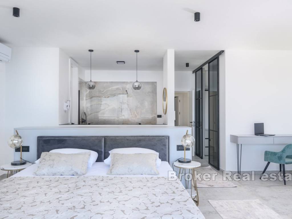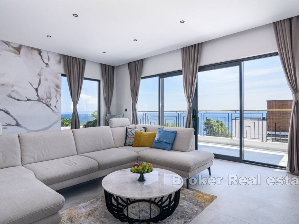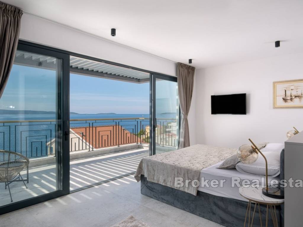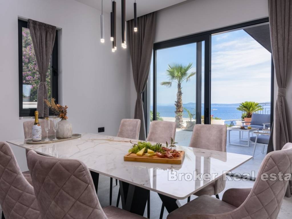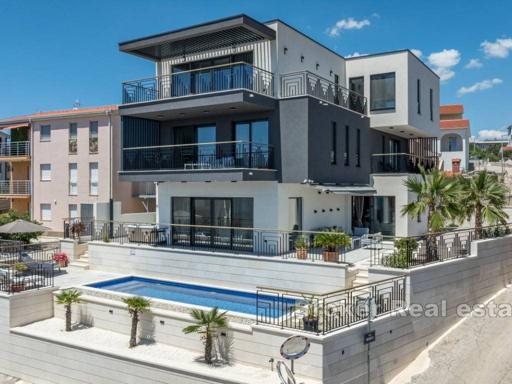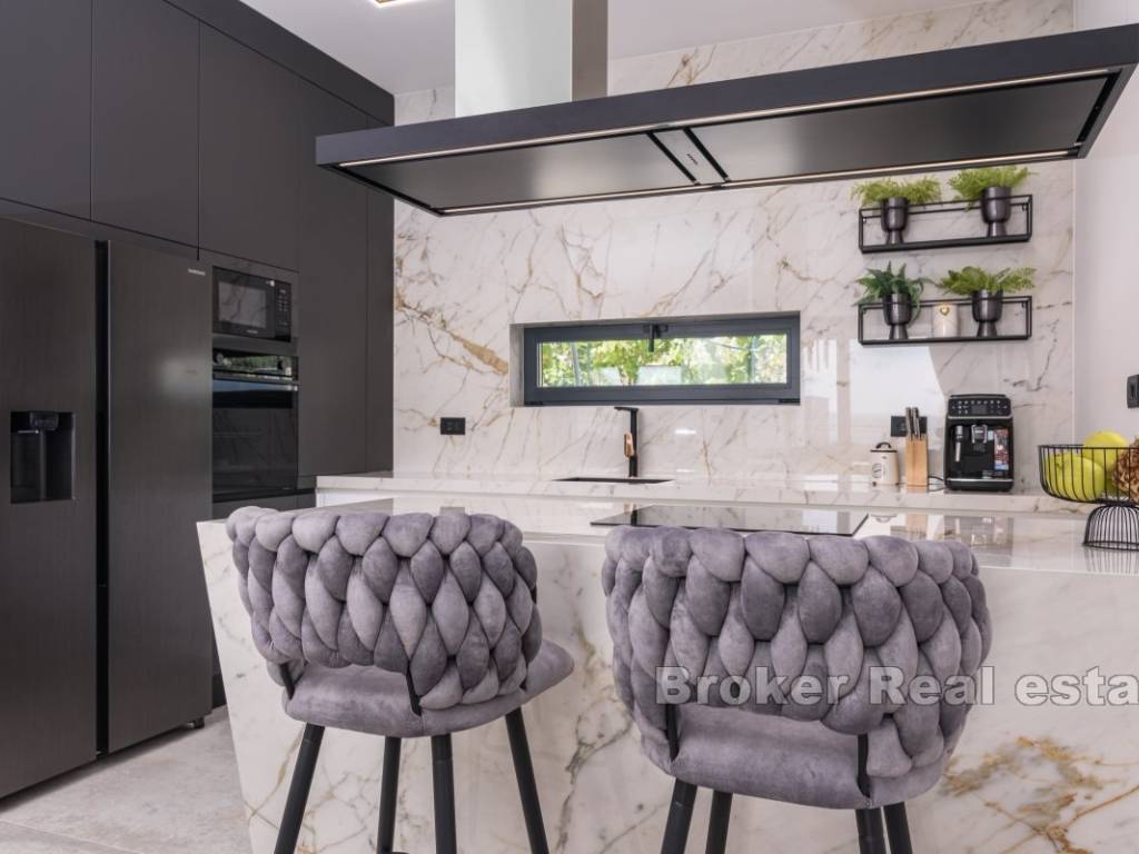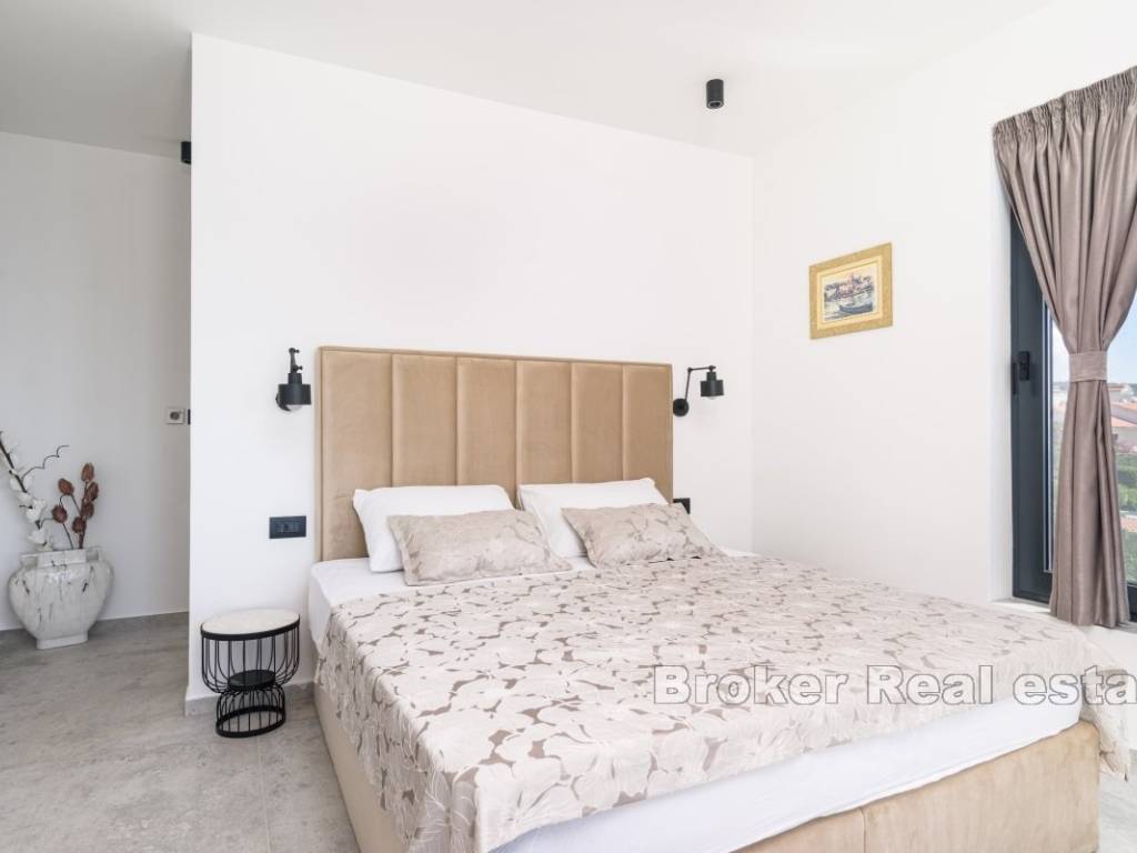 A luxury villa with a panoramic view of the sea and islands is for sale on the southern side of the island of Čiovo. Its 400 m of living space is situated on a plot of 537 m. All rooms are distributed over three floors, while the surroundings of the villa include various amenities.