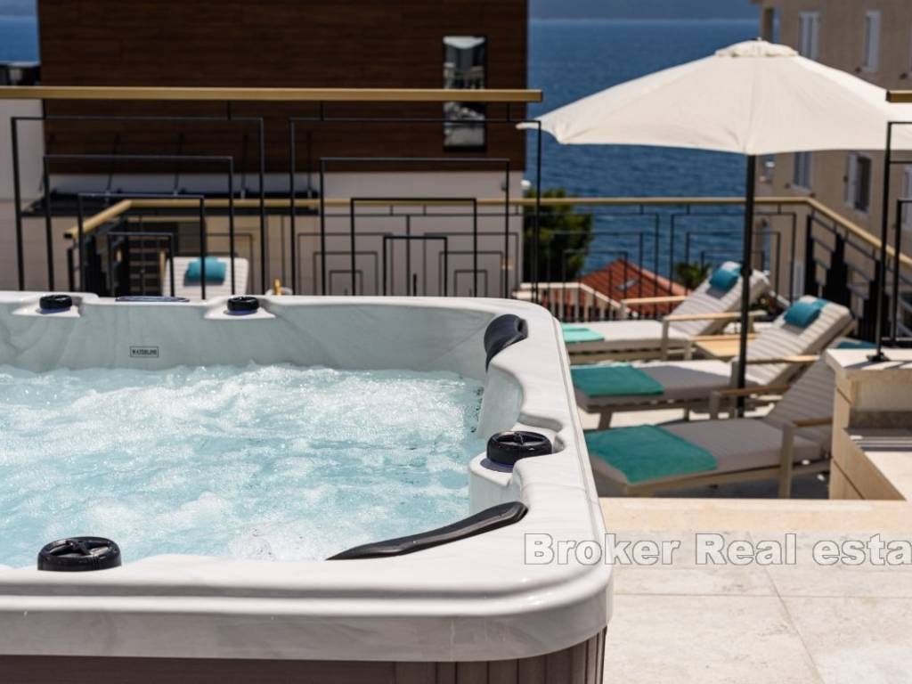 On the ground floor, there is a living area consisting of a kitchen, dining room, and living room, from which there is a sea view and access to the terrace. On the same floor, there is also a storage room and a toilet. An internal staircase, enriched with a glass railing that impresses with its aesthetics, leads to the first floor, where there are two bedrooms with en-suite bathrooms and access to a covered balcony with an open sea view. On the same floor, there is also a spacious gym and a sauna. On the top floor, there are three bedrooms with three bathrooms, among which the comfortable master bedroom stands out with a special feature such as a bathroom with a sea view.
