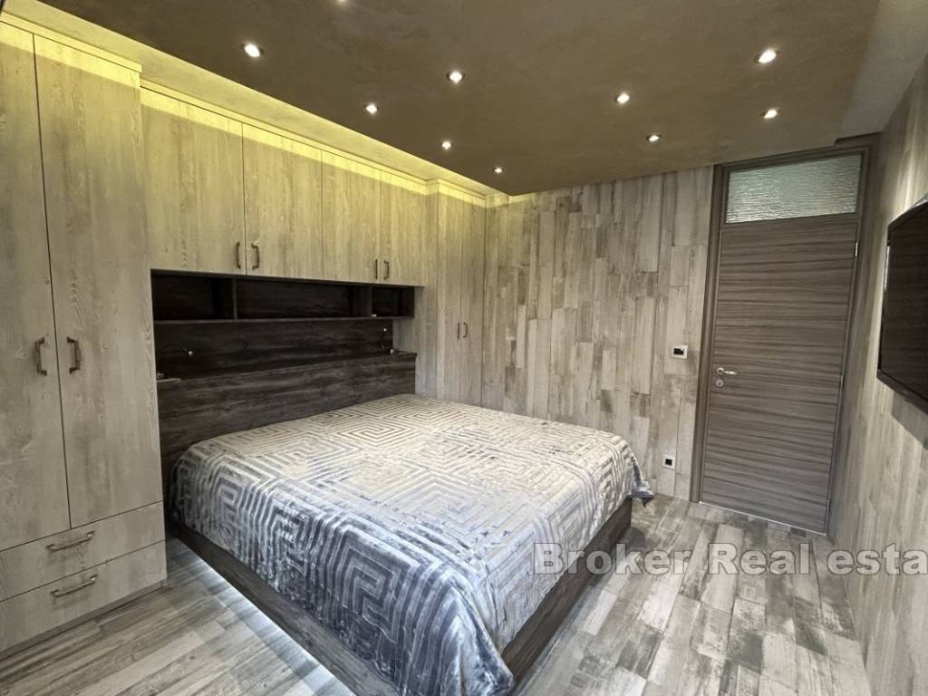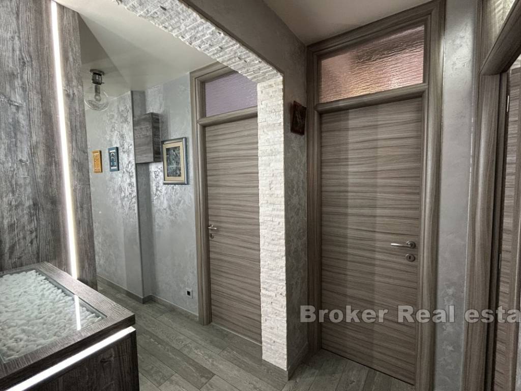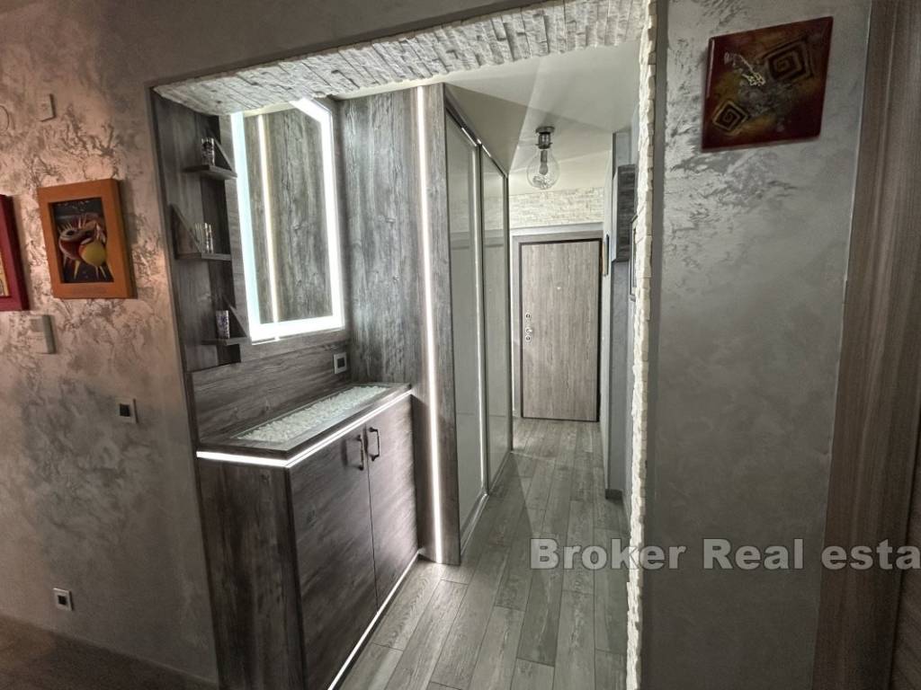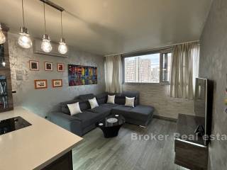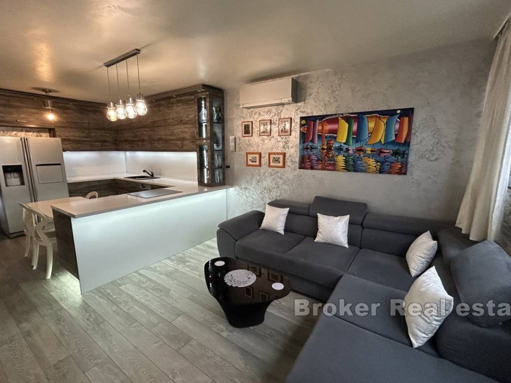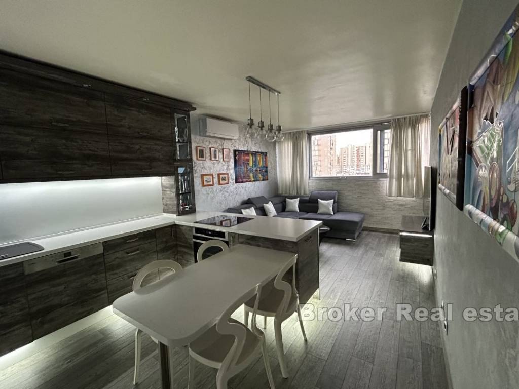 The apartment has an area of 66 m2, oriented south-north, and consists of 2 rooms, one with a double bed, while the other is left to the buyers choice as to what purpose he will give it, either as a bedroom or a study. The apartment consists of a kitchen with a dining room and a spacious living room in a unique space. The owners decorated the apartment by carefully choosing the furniture and numerous details in the space, paying special attention to the lighting. The apartment is for sale fully furnished and equipped.