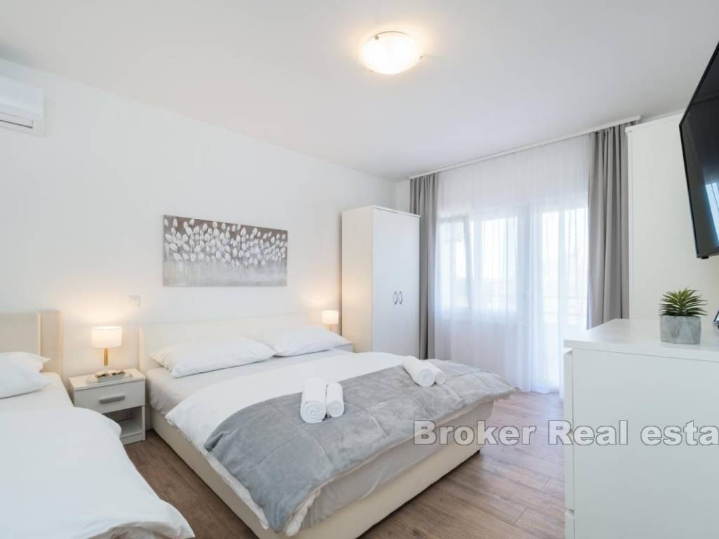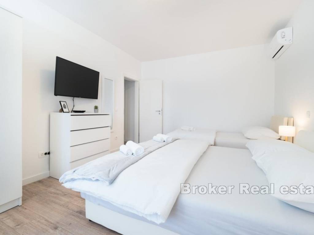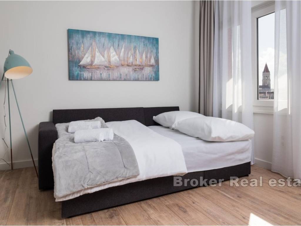A beautiful, fully furnished apartment located in the first row to the sea offers a spectacular view of the sea and the enchanting town of Trogir. With a living area of 63 m, it was originally a two-bedroom apartment but has been thoughtfully converted into a spacious one-bedroom unit, making it ideal for tourism purposes. The apartment has been elegantly and fully renovated, exuding modern luxury through its sophisticated design.