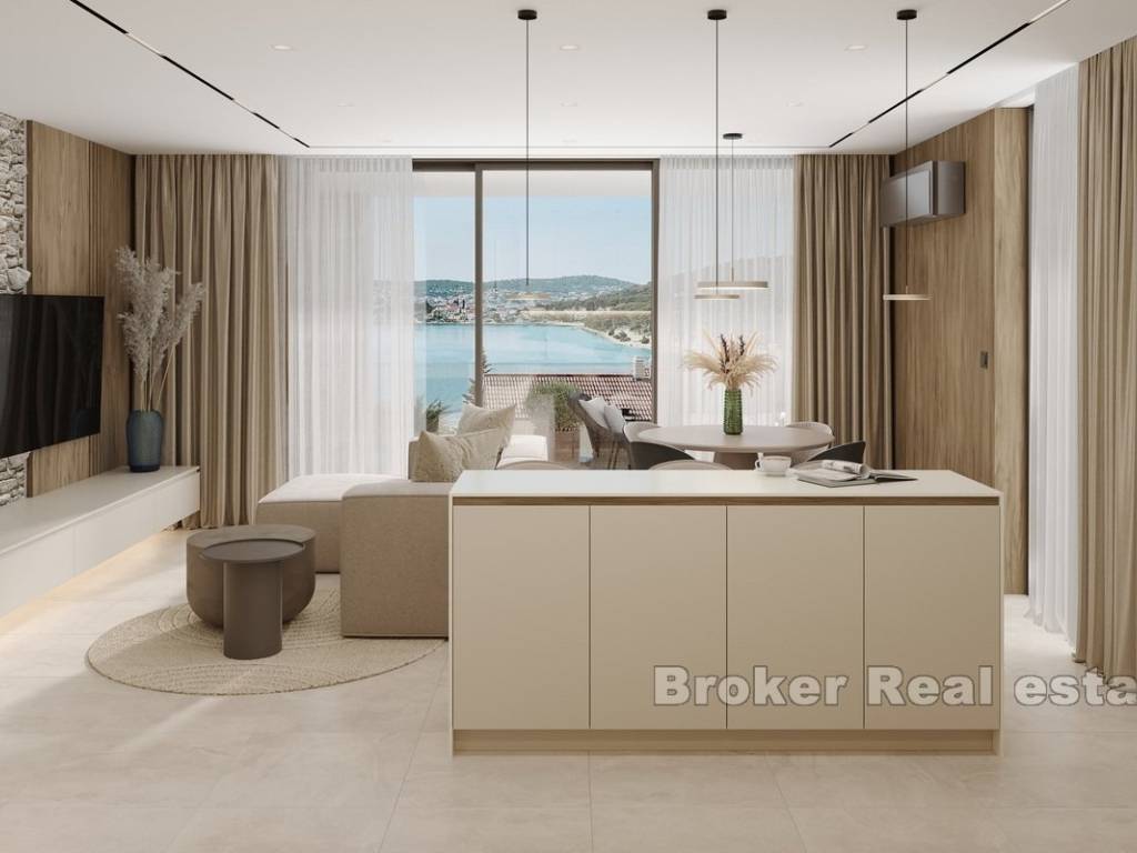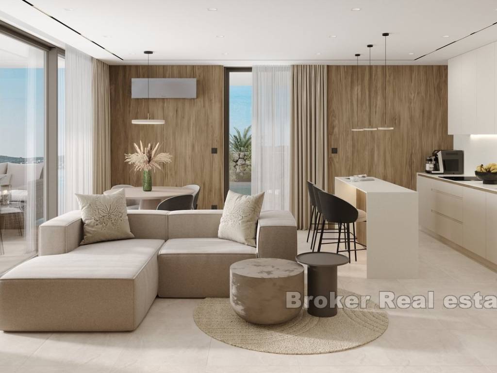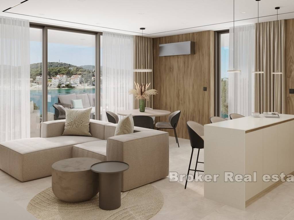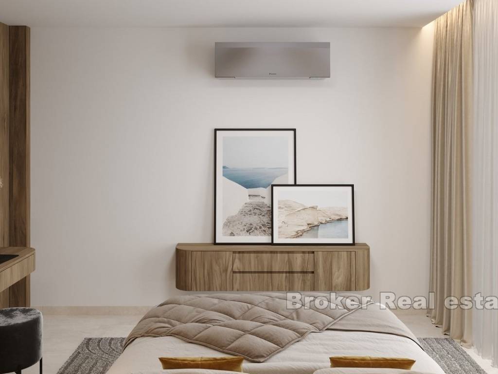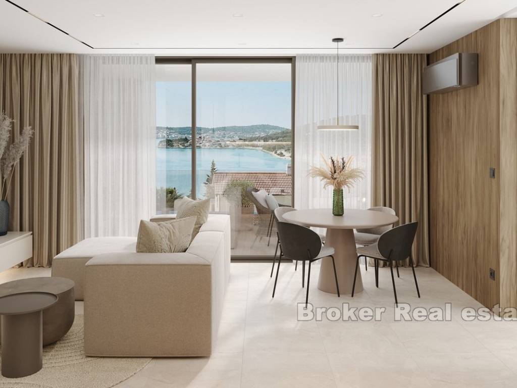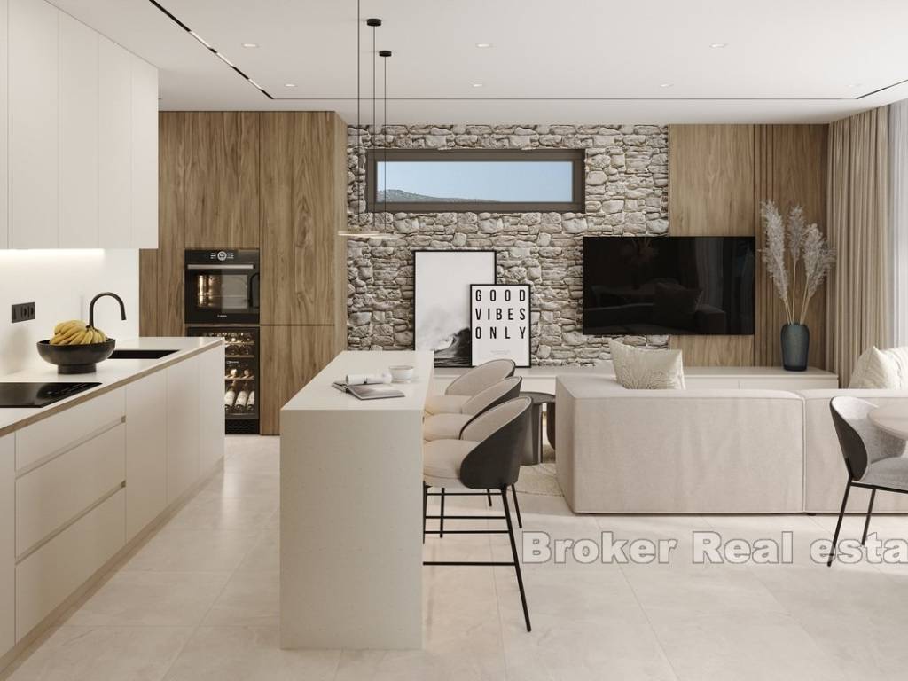 This modern apartment is located in a newly built building consisting of only three luxury apartments, ideally situated in Rogoznica, within walking distance to both the city center and the sea. The property offers stunning panoramic sea views, a private pool, and is built to the highest standards using premium materials and custom-designed furniture.