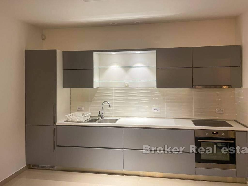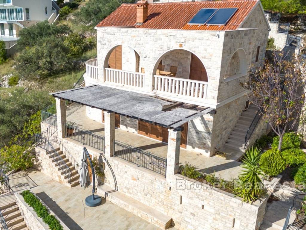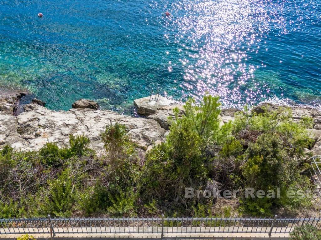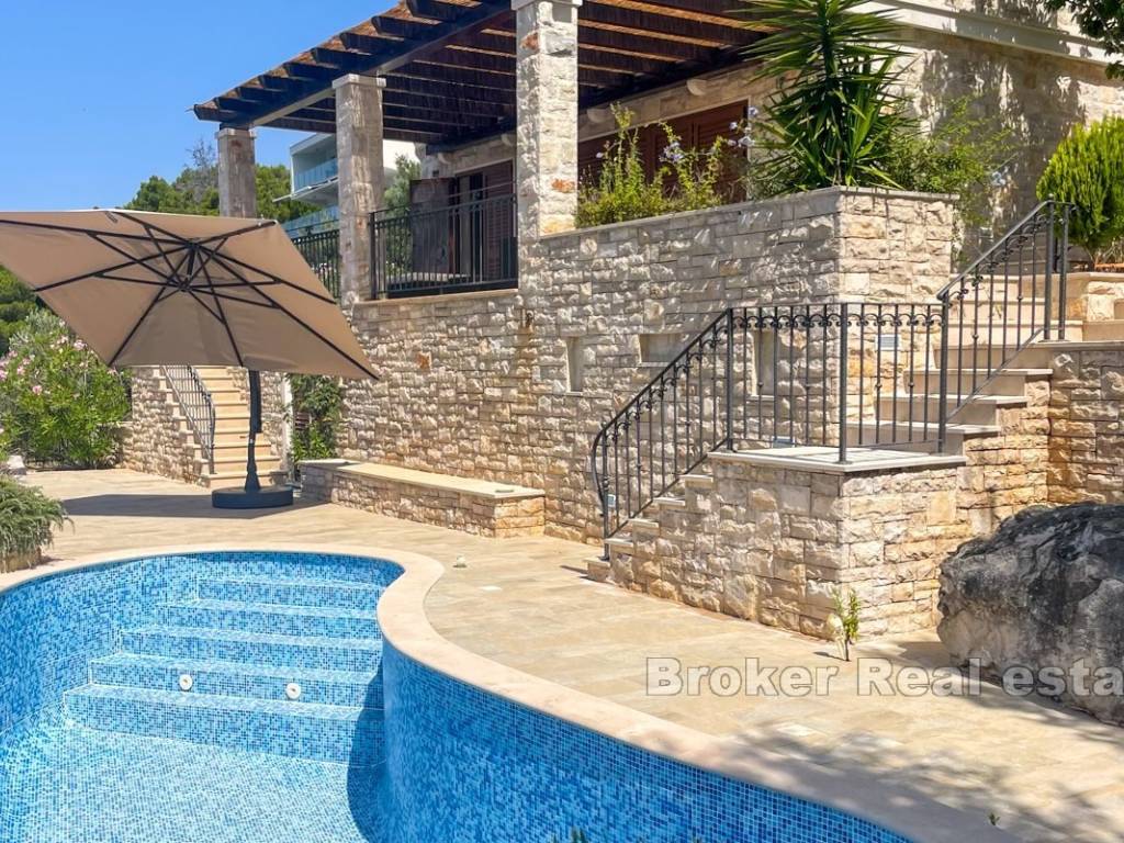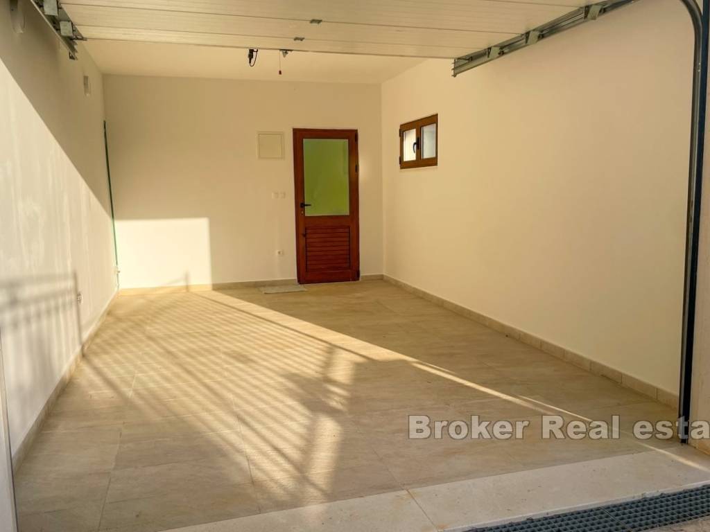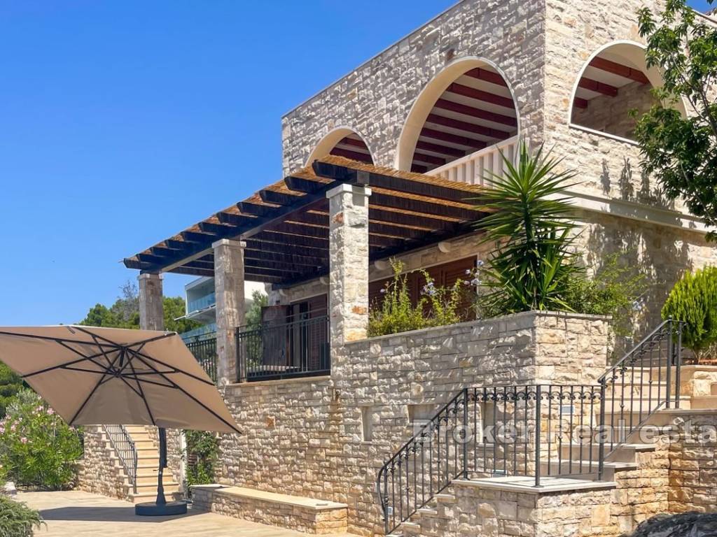The villa is located in a peaceful part of a beautiful bay, surrounded by modern villas and houses. Vehicle access is available to the top of the plot, where there is a garage and a covered parking space for two cars.