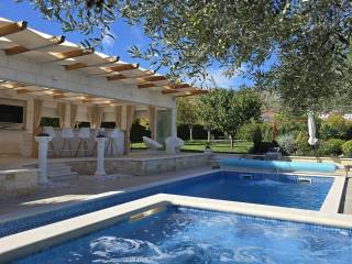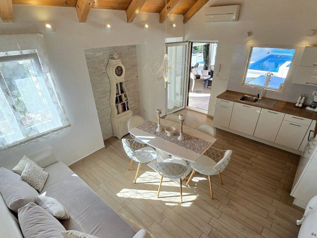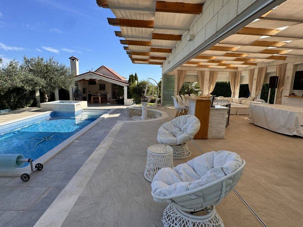 The house is spread over two floors. It consists of three bedrooms, on the ground floor there is a living room connected to a fully equipped kitchen and dining room, from where there is access to a covered terrace. The terrace is located directly next to the pool and the jacuzzi is additionally equipped with a summer kitchen and a barbecue area, creating a perfect space for relaxing and enjoying the outdoors.