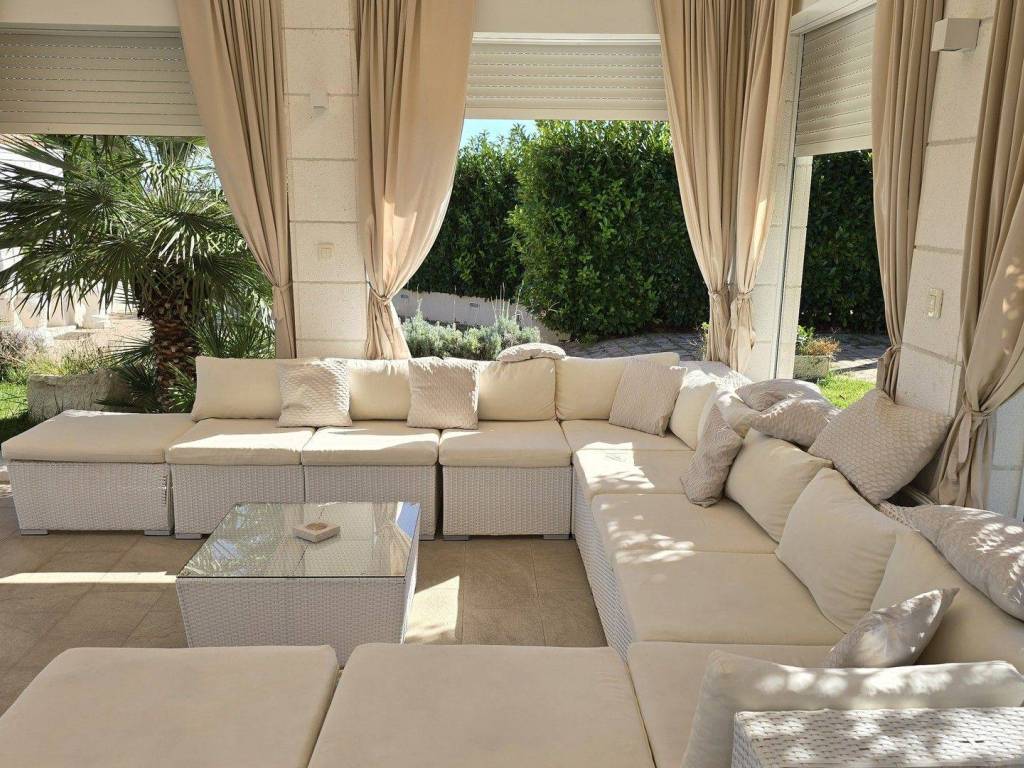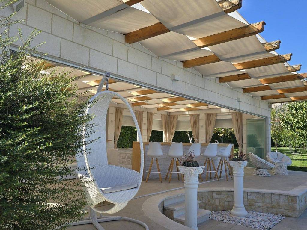 The outer part of the garden is enriched with a large covered area of 70m2 for outdoor gatherings. It is equipped with a pool table, TV, speakers, a large bar and a corner sofa. The beautifully landscaped garden is full of Mediterranean plants, it also has a childrens playground and other horticulture.