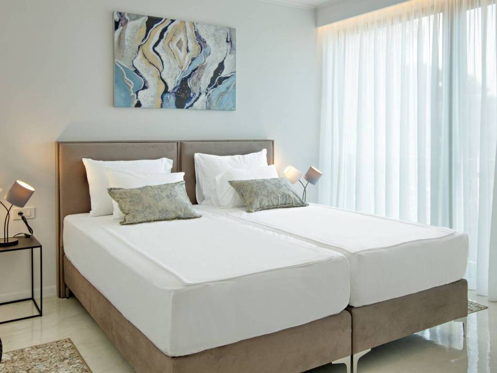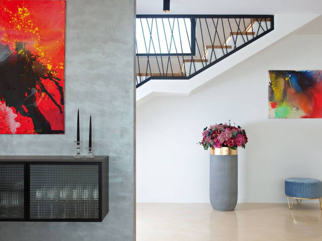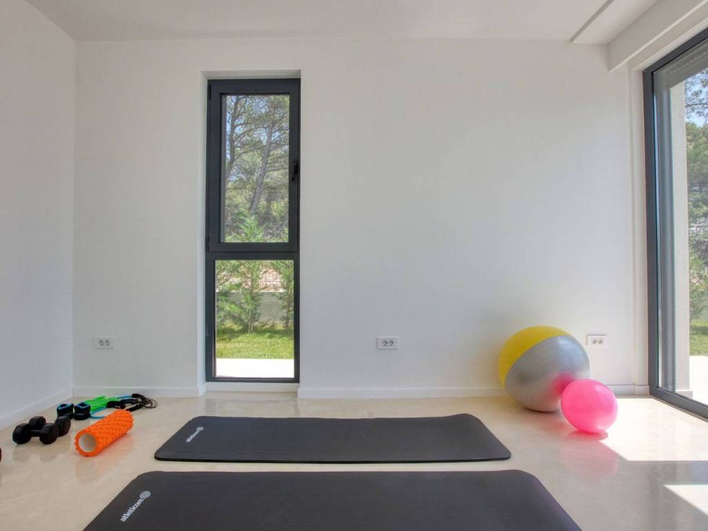The property extends over two floors. On the ground floor, next to the entrance to the house, there is a kitchen and dining room, a living room, a cinema room and a fitness room, as well as a bathroom. There are high glass walls along the length of the entire floor, and all rooms offer access to the outdoor terrace. An internal staircase leads to the upper floor, which consists of four bedrooms, each with its own bathroom and private balcony.