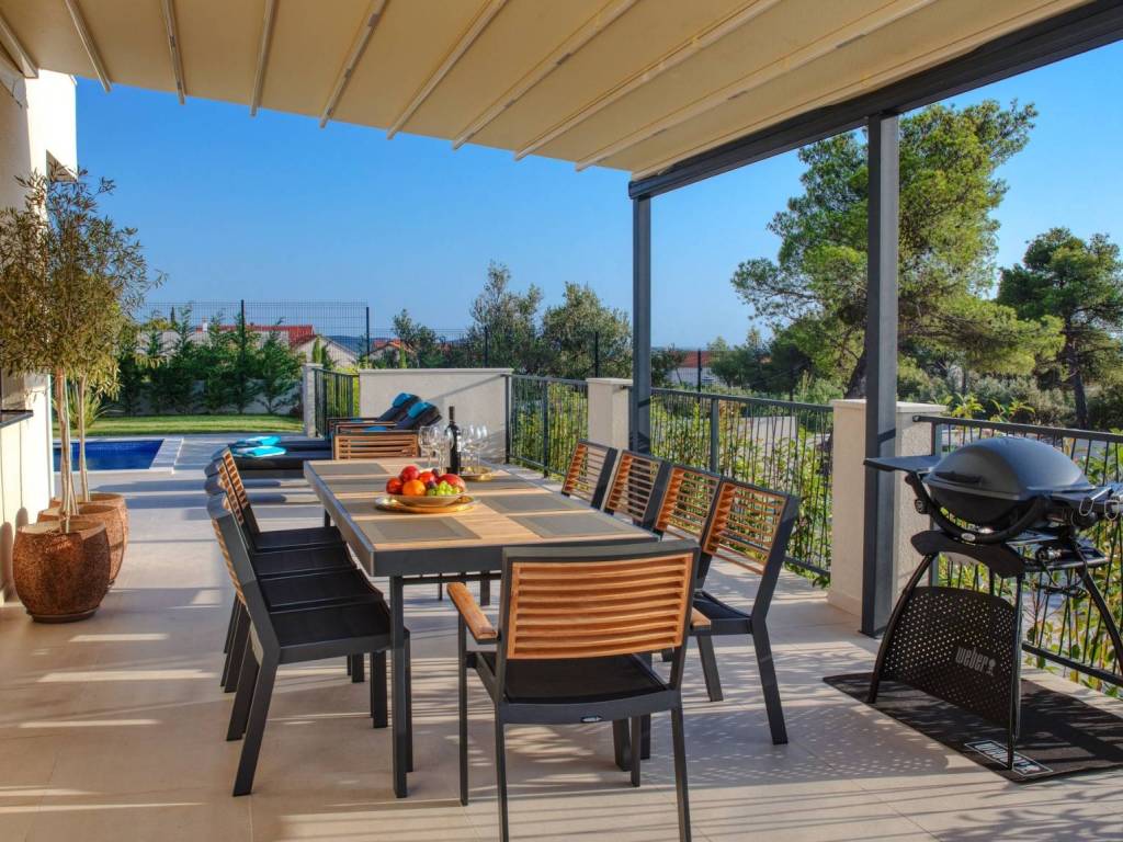 The grounds of the villa consist of outdoor covered and uncovered parking for three cars, heated swimming pool and outdoor shower, sunbathing area, garden, barbecue and dining room covered with an automated pergola.