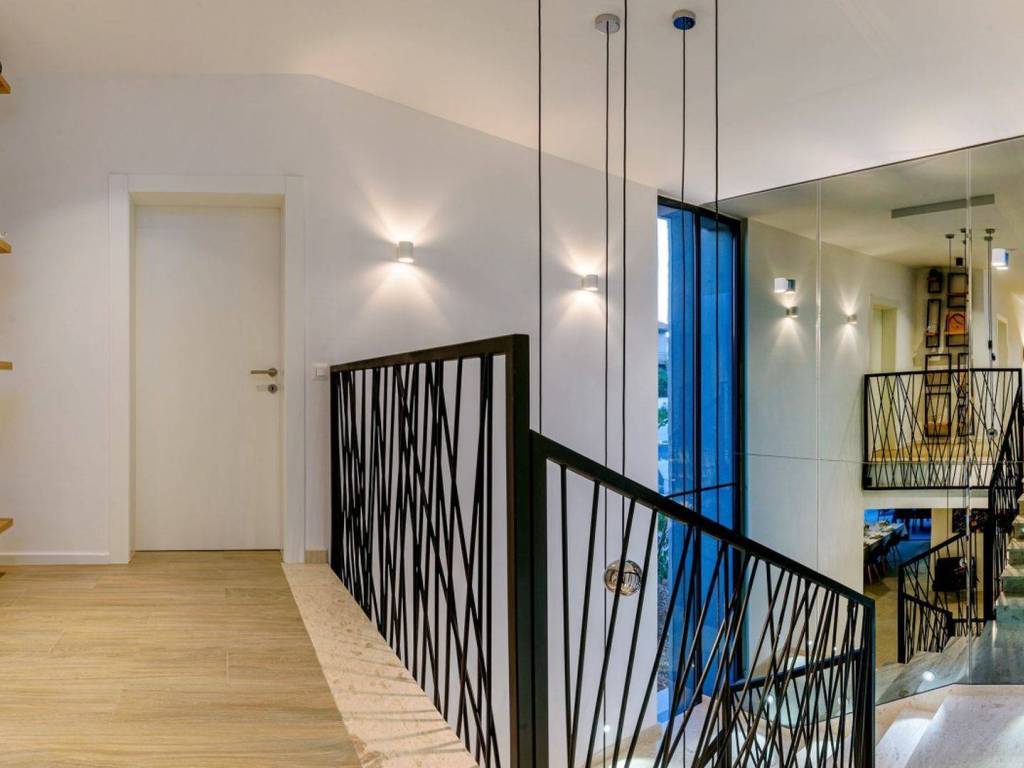 On the ground floor there is a kitchen, a dining room and a spacious living room with large glass walls connected to a terrace and a garden where there is a large heated swimming pool, a sun deck with deck chairs, an outdoor kitchen with a barbecue and a childrens playground.