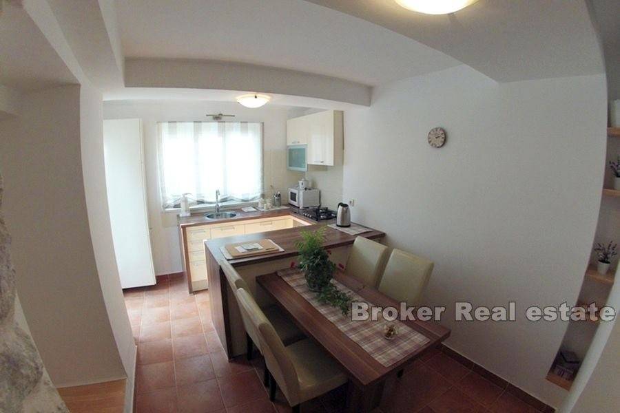 The apartment consists of a kitchen with a dining table, a living room and a spacious bedroom with a separate bathroom. On the walls there is stone that has been preserved from the original design of the old stone house, and they have been cleaned and protected, on the ceiling there are old wooden beams that give it a special touch of old autochthonous taverns.